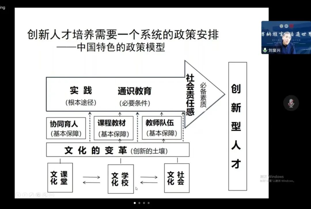 在此背景下,刘复兴教授从三个方面出发,围绕拔尖创新人才培养问题,深入阐述其见解:一是创新发展观在我国的提出与发展,指出我国在人才规模和结构存在明显短板的情况下提出创新战略的必要性。二是创新理论与拔尖人才素质结构探索,刘教授从熊彼特创新概念引入,指出创新是“生产要素的重新组合”,教育创新体系成为国家创新体系的纽带之一;他结合我国教育体系现实状况,提出拔尖创新人才需要具备四种能力,即:综合的知识基础、T型素质结构、高度社会责任感和实施创造性劳动并获得创造性成功的能力。三是中国教育必须解决培养拔尖创新人才问题,刘教授从人才体系、基础教育价值、教育政策体系、数字文明下创新人才的数字技术素养等方面出发,指出人才培养是一个系统性工程。