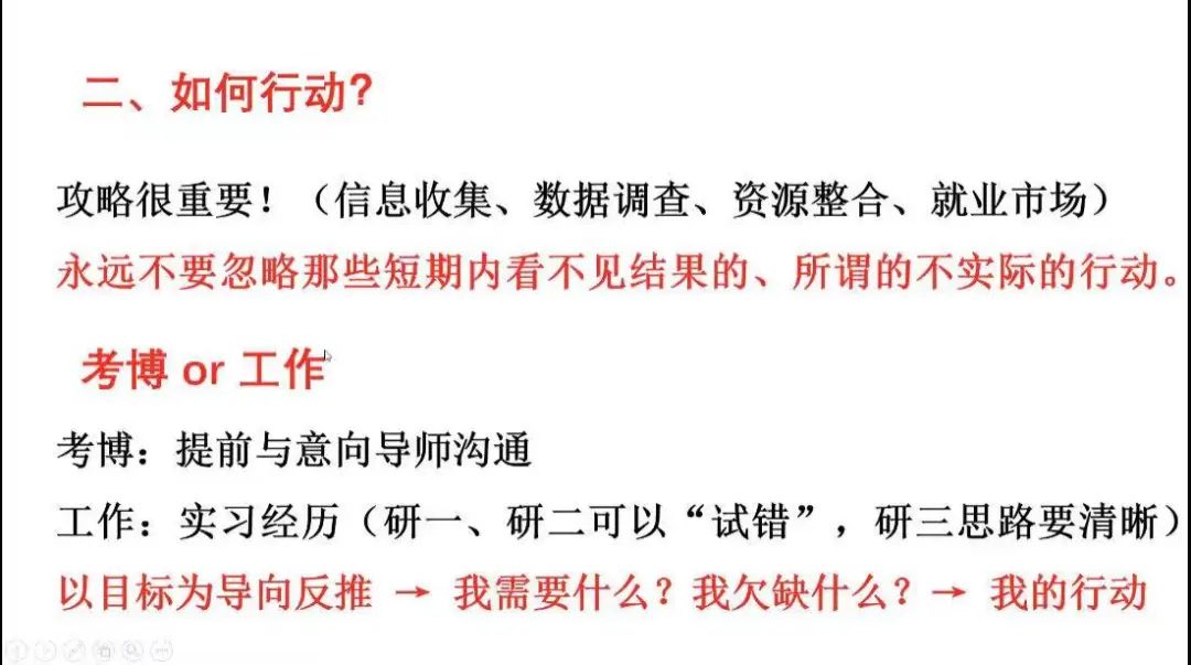 马欣然指出研一就要开始思考自己想要什么,设定目标并行动。在时间分配和整体规划时,她强调攻略很重要,在求职前需要完成信息收集、数据调查、资源整合、就业市场分析的工作,提醒大家永远不要忽略那些短期内看不见结果的、所谓的不实际的行动。