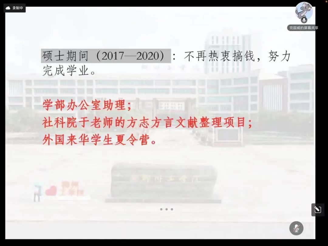 首先,完国威分享了个人的学习经历及工作经历。他在本科期间就做了很多兼职工作,参加了一年的支教工作。硕士期间,担任学部办公室助理的工作,积极参与了社科院于老师的方志方言项目、外国来华学生夏令营等项目。