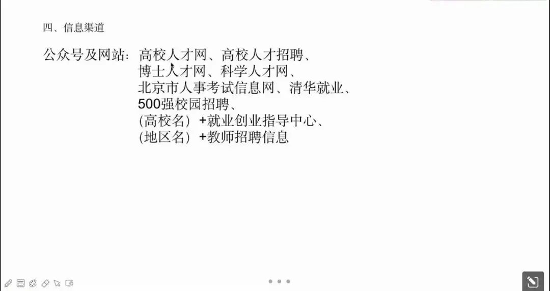 最后,她还向大家介绍了多种信息渠道,诸如高校人才网、高校人才招聘、博士人才网、科学人才网、北京市人事考试信息网、清华就业500强校园招聘等,提醒大家要拓宽信息收集渠道。