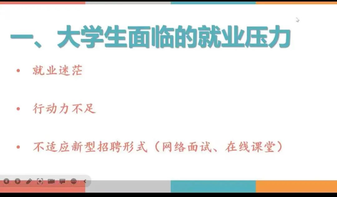 庾点首先分析当前就业压力巨大的原因,从外部原因上看,目前就业大环境岗位少,质量下降,面试、考试延迟等。从内部原因上看,不少同学存在就业迷茫、行动力不足、不适应新型招聘形式(网络面试、在线课堂)等问题。