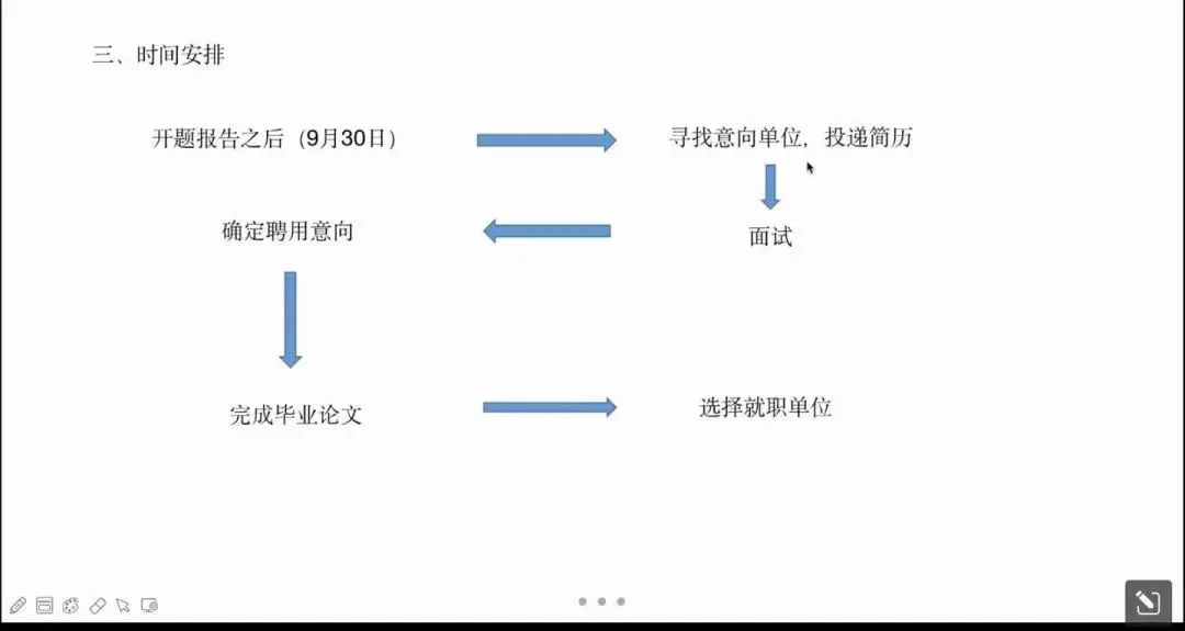 面临当前的就业压力问题,她指出,要平衡好学业与就业。总原则是要保障有效学习、就业时间。学业方面:积极联系导师,和老师保持良好沟通。就业方面:保证每日规定的学习和就业规划时间。关注网站、公众号扩宽人际资源,拓宽资源,主动应变。