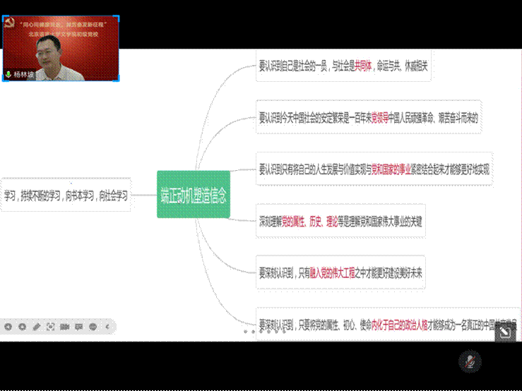 杨老师在讲座中阐释了入党动机的概念和重要性,他认为动机的形成由内在信念与外在诉求两种要素构成和促动,正确的入党动机应该是要不断塑造和强化内在信念的过程和结果,这也是未来每一位同学在成为一名中国共产党员“初心”的形成和强化时期。从动机到初心,这是党组织“严把入口关”时要时常、反复问的问题,是每一位党员要不断自我检视的问题。正确动机是为实现共产主义、全心全意为人民服务而要求入党的,因为它与党的性质、宗旨、奋斗目标和党员条件是一致的。杨老师列举出不良动机的几种类型,让学员们审视、纠正、完善自我。