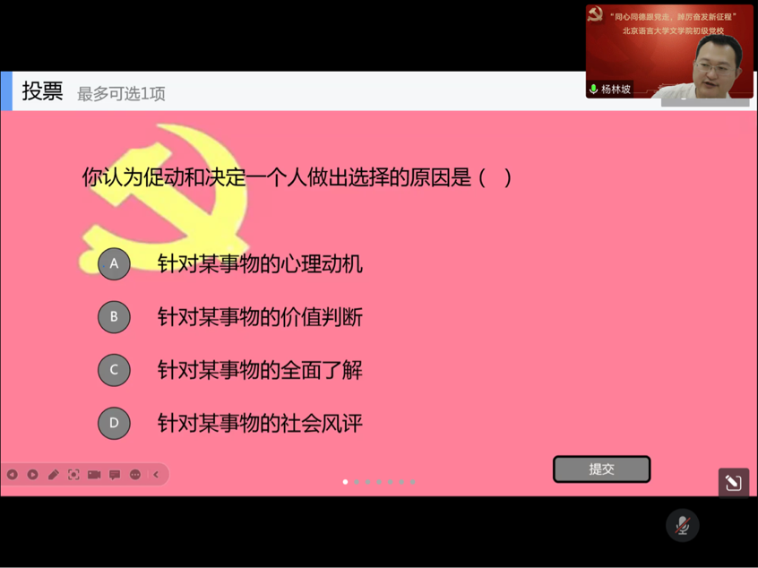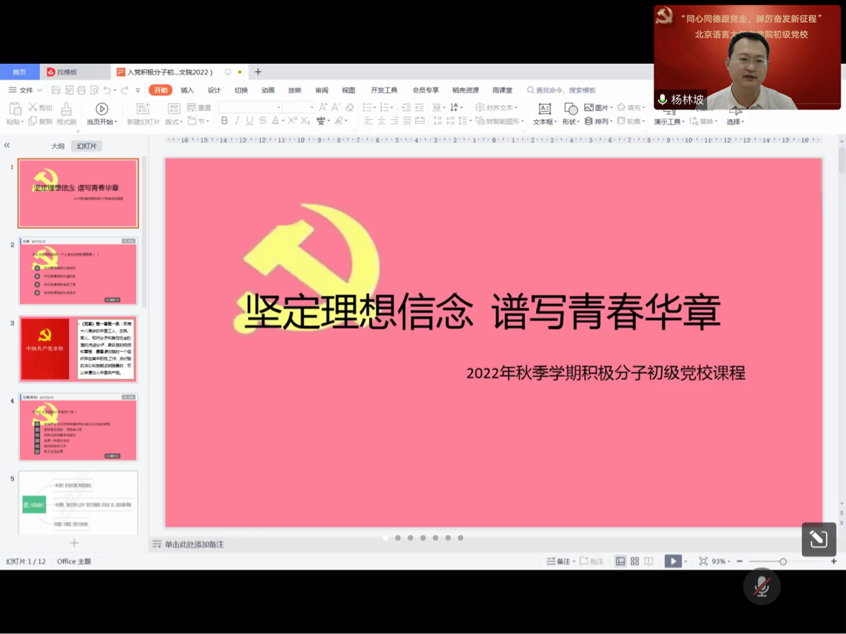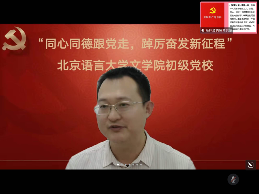 “同心同德跟党走,踔厉奋发新征程”北京语言大学文学院初级党校第二讲于11月23日线上开讲。马克思主义学院总党支副书记杨林坡主讲题为“坚定理想信念,谱写青春华章”的讲座,共有80余名学员参加。