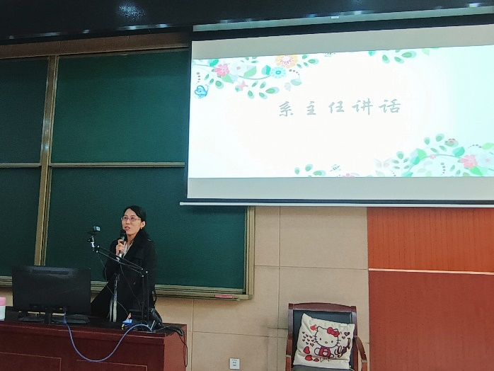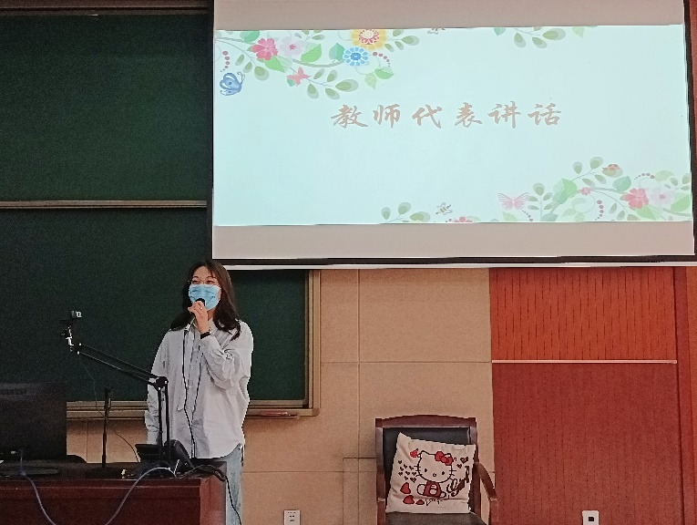 下一个环节,由金美辰老师代表韩语系教师进行讲话。金美辰老师回顾了四年以来韩语系学生的优越表现,对同学们取得的优秀成绩表示了充分的肯定,也对还在努力拼搏的同学们送上了鼓励。金美辰老师最后表示,希望能在毕业典礼上见到大家充满活力的身影。