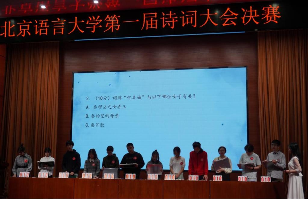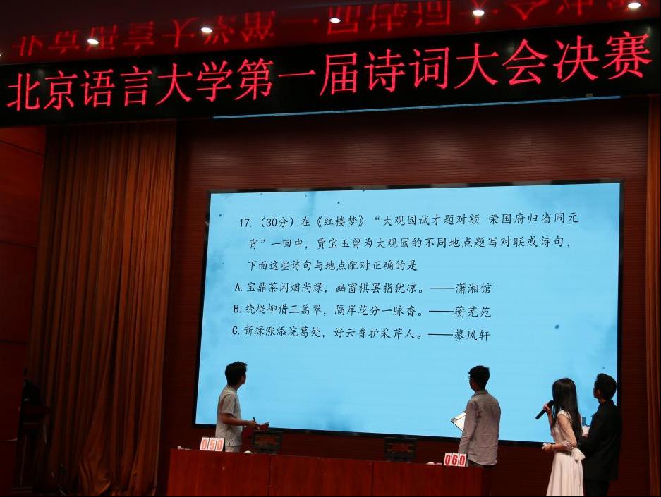 北京语言大学第一届诗词大会由文学院主办,文学院团委承办,系校学术文化节系列活动之一。本次活动旨在展现中华诗词的魅力,弘扬中华优秀传统文化,强化同学们传承与创新中华优秀传统文化的意识。诗词是中华民族精神家园的重要构成部分,是社会生活的结晶,是民族品质、品格的生动体现。希望同学们能以本次比赛为契机,更加深入地了解并学习诗词以及相关的知识,领略中华诗词的博大精深,拥有一颗诗心,将其融入到生活之中,传承与发扬诗词文化。