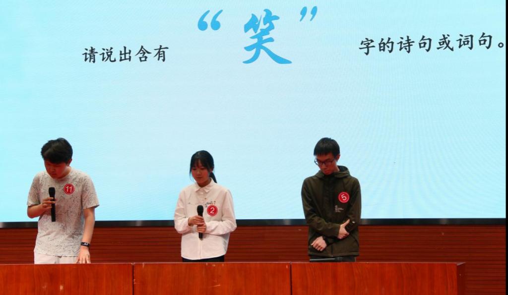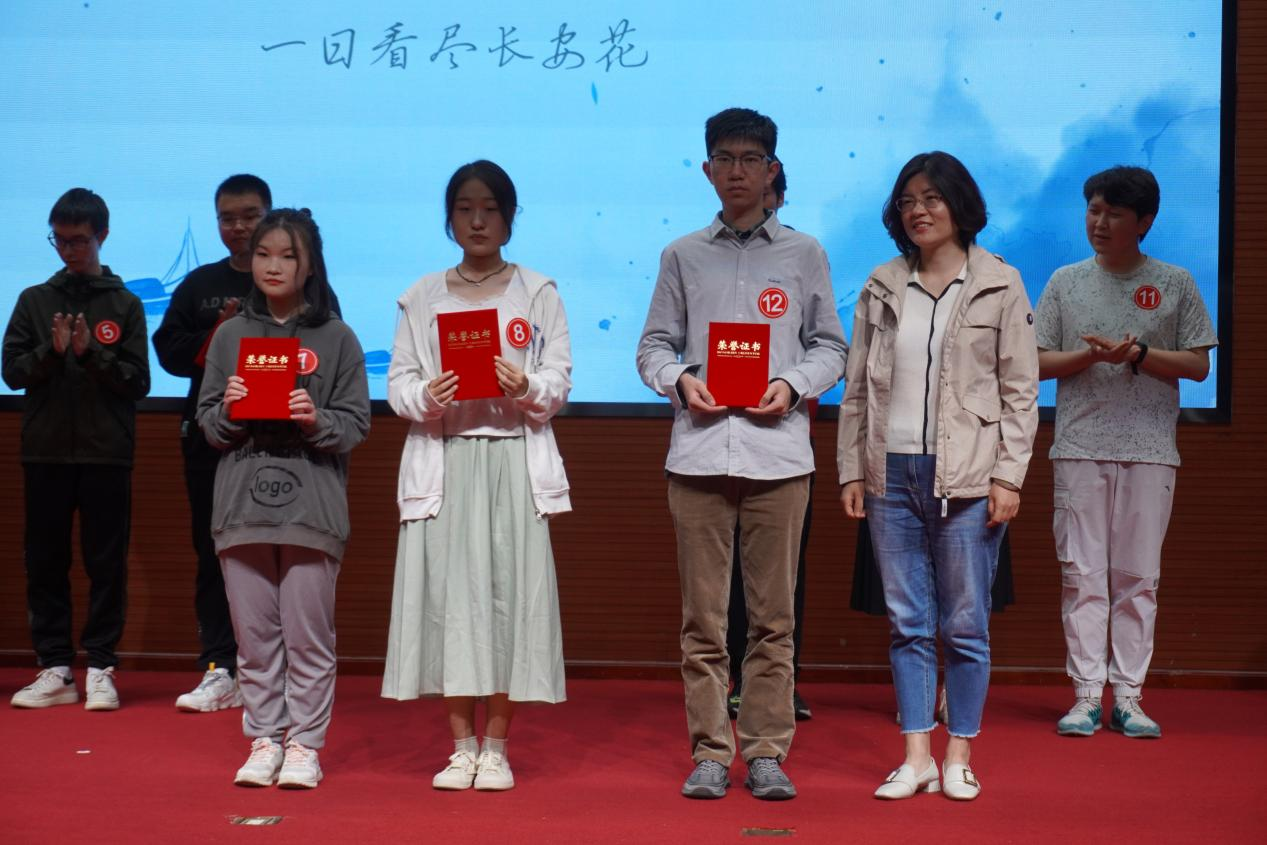 第三轮最终对决“春城无处不飞花”采取了飞花令,以每位选手说出十二句为一回合,以留场时间决出名次。该环节非常考验选手们的诗词储备量,选手们沉着应对,运筹帷幄,展现了深厚的底蕴,其精彩绝伦的表现也紧紧牵动着现场观众的心弦,引得了老师与同学们连连赞叹。经过三轮飞花令的角逐,最终孙雨川同学夺得桂冠,悟日眤乐、傅秋伊荣获二等奖,刘豫茜、李可心、崔祚诚获得三等奖,优秀奖获得者为宁健鑫、张怡、张晨瀚、刘妍、蔡治浩、王璐璐