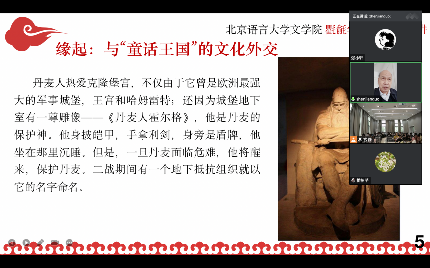 4月21日下午,北京语言大学文学院“氍毹学术沙龙”第1讲顺利举办。讲座嘉宾中华人民共和国前驻丹麦王国特命全权大使甄建国先生以《中华文化走向世界的典范案例:京剧<王子复仇记>与文化外交》为题,结合二十大报告精神,与师生分享了京剧《王子复仇记》通过文化交流走向世界、配合我国外交事业,讲好中国故事的历程。