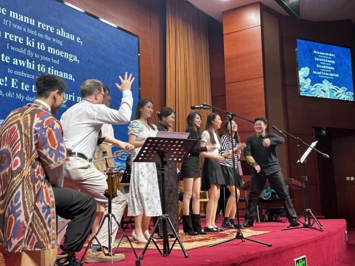 最后,音乐会在端午节高温酷暑中落下帷幕,将热烈的气氛推向高潮。陈霞书记和谢嘉幸教授分别上台发表讲话,祝贺音乐会的圆满成功,并鼓励同学们继续在音乐的道路上勇敢创新,开拓视野,促进多元音乐文化的交流、互鉴、互赏,共同拥抱文化差异的美丽,树立正确的世界音乐观,乘着音乐语言的翅膀跨越五洲,走向世界。这场音乐会不仅为观众带来了音乐盛宴,也进一步推动了不同文化间的相互理解与交流。