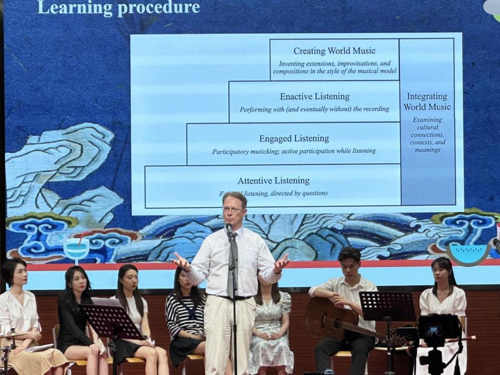 本次音乐会是北京语言大学艺术学院《跨文化音乐交流》课程的结课讲座音乐会。该课程连续五年得到科技部外专引智工程项目的支持,进行了中外师资课程合作建设。音乐会首先由北京语言大学艺术学院教师姚紫津进行综合介绍,对课程和结课音乐会的主旨理念进行了讲解。接着,著名音乐教育学者、民族音乐学家戴维(David Hebert)教授对本课程的核心概念进行进一步阐释,并介绍了课程的主要实践流程。