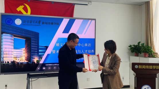 期间,云国强院长为方攀颁发业界导师聘书。方攀表示将继续发挥桥梁纽带作用,期待北语青年学子的加入为融媒体中心注入“新鲜血液”,带来更多创新性想法,促进节目质量的提升,另一方面也将尽力为北语新传学子们提供更多实践机会,搭建更广阔的的发展平台。