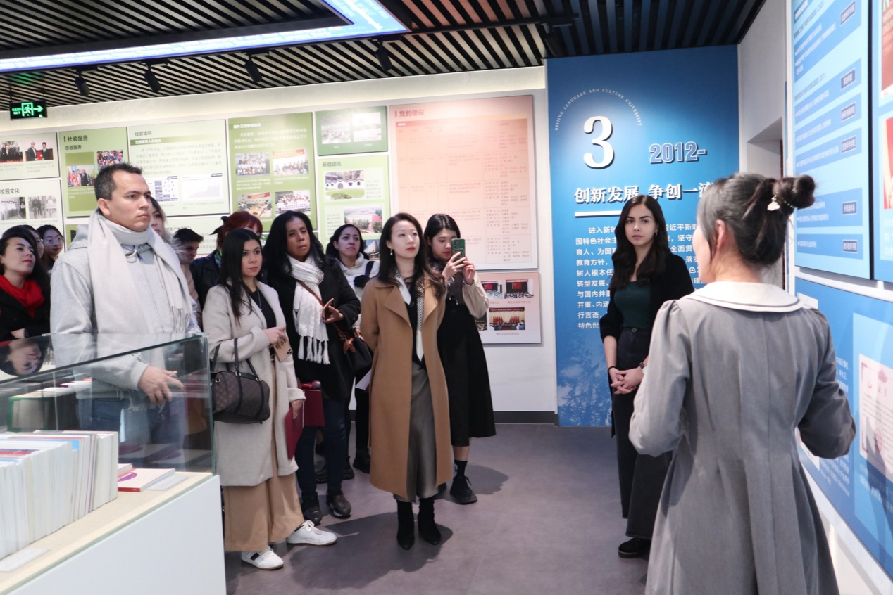 北语学子热情周到的讲解给拉美记者留下深刻印象。“我从尼加拉瓜来到中国北京,几乎跨越了半个地球的距离”,尼加拉瓜总台记者诺埃里亚•阿劳兹拉着中国学生的手,柔和缓慢而又坚定地说道,“虽然我们相离很远,但我总是心系中国。我们和你们就像这样,始终手牵手,心连心。”记者们对中外学生用多语讲述校史故事的出色表现点赞,并鼓励大家发挥所长,在促进中外文化交流方面继续努力。这次交流虽然短暂,却囊括了精彩的内容,承载着深厚的情谊,如冬日阳光,令参与其中的同学们与记者们倍感温暖。“中西合璧”共叙校史芳华,让“小联合国”再次见证中拉之间的友好往来。