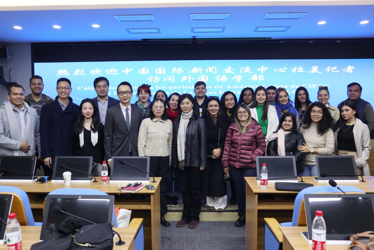 11月13日,中国国际新闻交流中心16个拉美国家的21名记者在外交部新闻司公共外交处副处长李超、中国国际新闻交流中心拉美中心主任韦龙宇的带领下到访北京语言大学外国语学部。学部副主任穆杨、西班牙语系主任周钦、拉美研究中心主任孙新堂、英西复语专业负责人周思蕊及中外学生代表与记者团热烈交流。