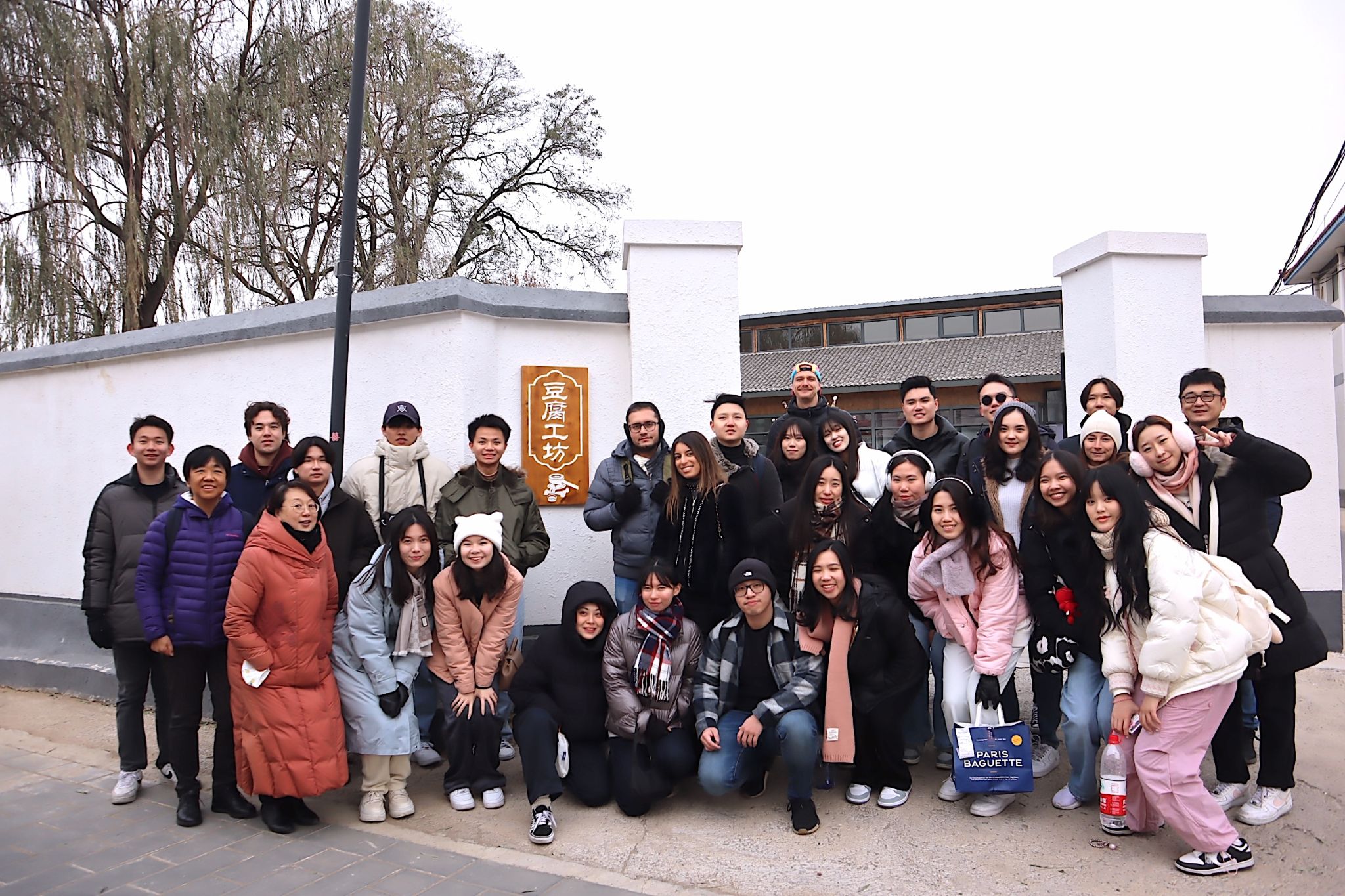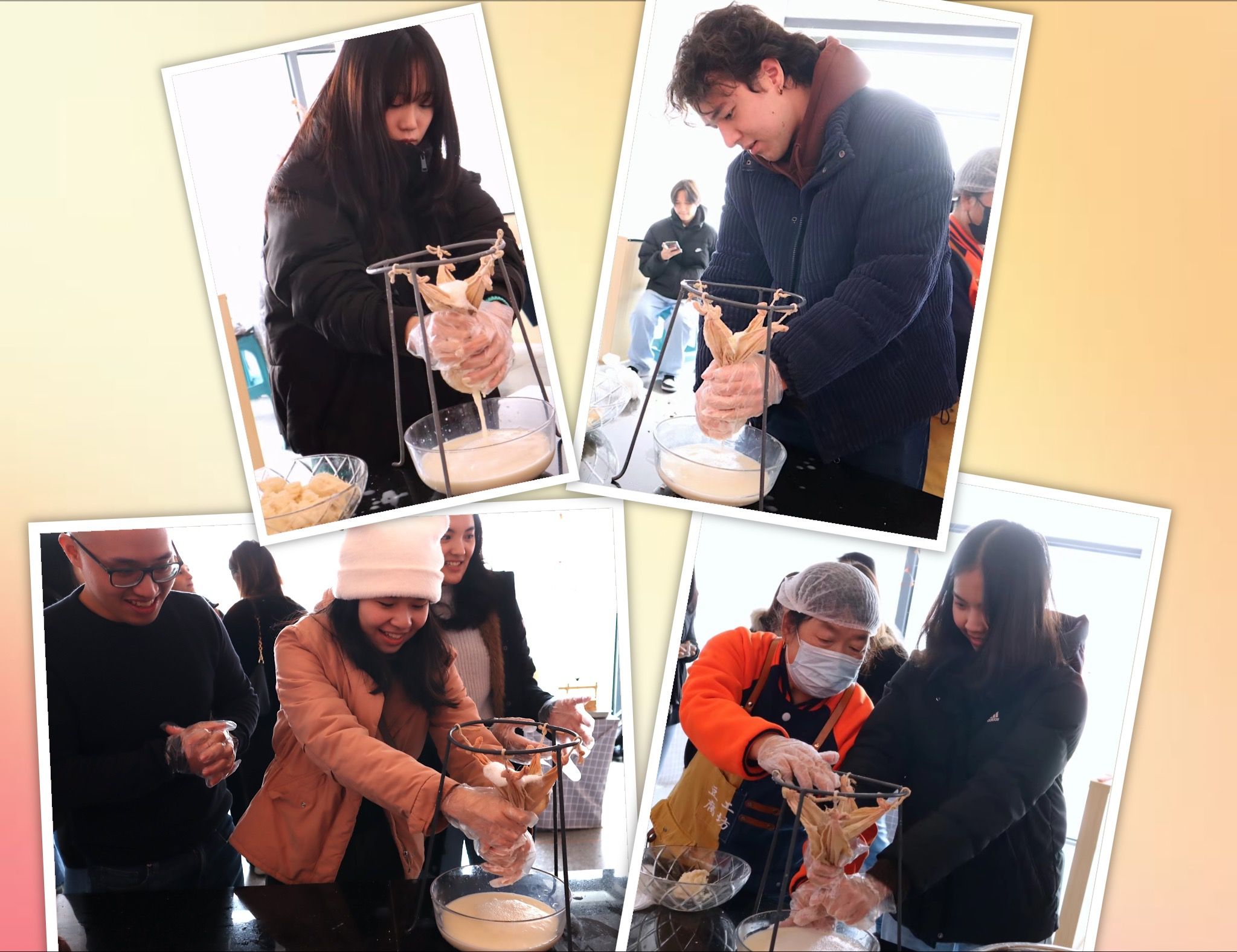 随后,学生们穿村来到柳沟的豆腐工坊,亲自体验了豆腐制作的全过程。从浸泡、磨浆、泼沫、滤渣到煮浆、点卤、压块成型,每个步骤都是一次对中华传统手艺的深入了解。“十颗豆,逆时针磨十圈”,在现场工作人员的指导下,留学生们分成六个小组,组员们配合默契,兴致勃勃地添豆子、磨豆浆、滤豆浆、挤豆渣、点卤汁、压豆腐,经过一系列的操作,最终热气腾腾的新鲜豆腐被端上了桌,撒上一些盐和小葱,一道美味的小葱拌豆腐就呈现在大家的面前。同学们纷纷上前品尝自己亲手制作的豆腐,个个赞不绝口:“自己做的豆腐就是香!”在体验过程中,大家得知柳沟的豆腐之所以好吃,是因为“村里的水好,豆腐好,做出来的豆腐宴自然好吃”;也了解到柳沟村靠着做豆腐宴,从一个不起眼的村落成为京郊远近闻名的民俗旅游村,因地制宜走出了一条独具特色的乡村振兴之路。