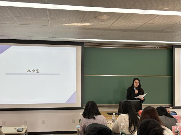 主持人介绍会议流程后,校研会主席团成员和部长层分别进行述职演讲。各部门汇报一学期以来的工作情况,整理经验并反思不足,为部门未来工作做出规划。