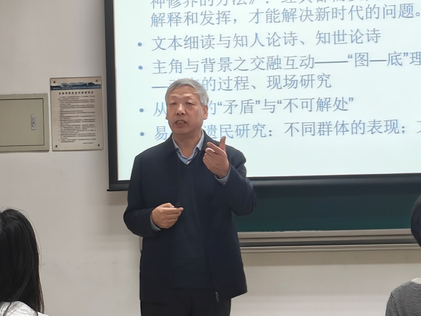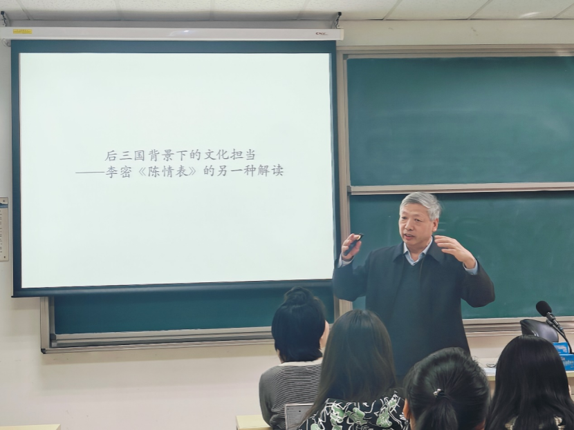 开班仪式后,张廷银教授为学员们做了题为“后三国背景下的文化担当——李密《陈情表》的另一种解读”的学术讲座,这也是本学期基地班荣誉课程《中国文学文化研究专题》的首场报告。现场座无虚席,气氛热烈。