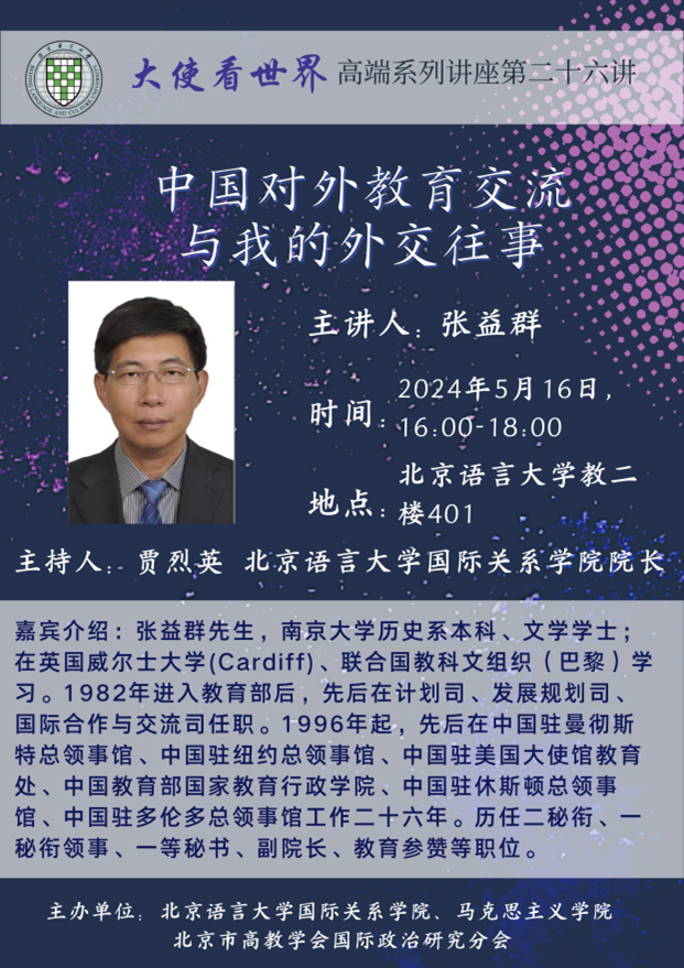2024年5月16日,“大使看世界”第二十六讲在北京语言大学教二楼401举行。本次讲座由北京语言大学国际关系学院、马克思主义学院和北京高教学会国际政治研究分会联合举办,其主题为“中国对外教育交流与我的外交往事”,主讲人为原中国驻外使领馆教育参赞张益群老师。北京语言大学国际关系学院贾烈英老师、项皓老师,国际关系学院一年级、二年级本科生和研究生一年级学生,以及区域国别学博士生们参加了本次讲座。