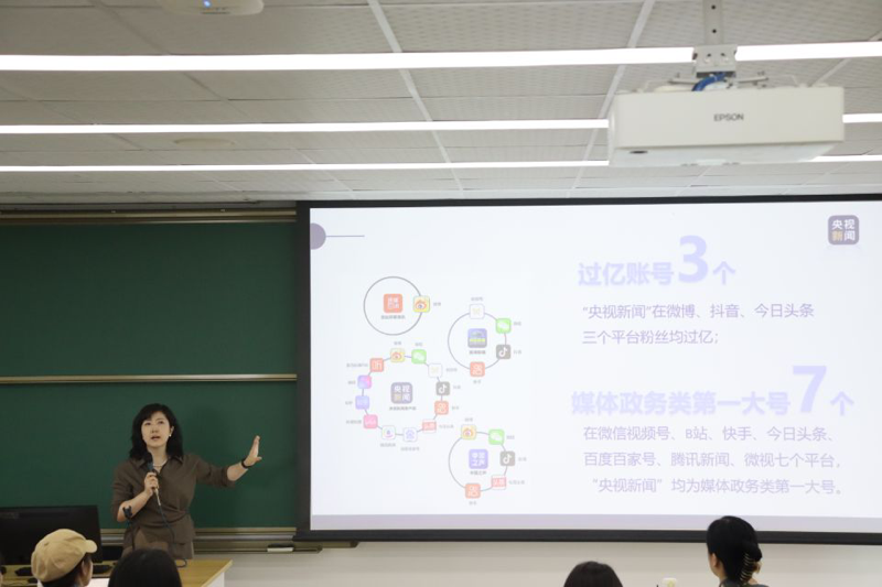 柴婧校友以其过硬的专业素养,为在座同学剖析了当今网络传播变化的三个趋势,并一一讲解了应对之方。她详细介绍了制作短视频的基本操作,并以央视短视频为生动案例,使同学们对短视频的相关知识有了更直观的感受和更深入的学习。随后,她也从创作形式、内容选题、创意策划等多方面展开细致讲解,并结合自己亲身的工作经历,与同学们分享了在短视频创作中注入一些创新元素和加分亮点的方法。柴婧校友强调,同学们应该在日常关注短视频的同时,用“跳出来”的思维分析短视频背后创作的思路,深挖文化根脉,共探传播之路。