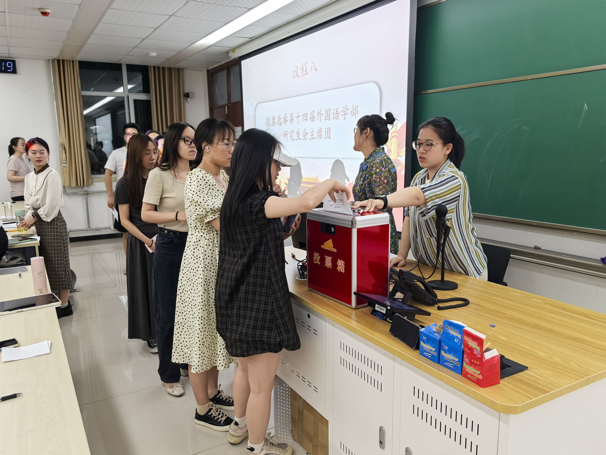 竞选演讲过后,工作人员组织与会代表进行投票。此次选举秉持公平公正公开原则,采用纸质选票投票,多余选票当场作废。片刻后,所有代表轮流上前,将各自宝贵的一票投入票箱,并由工作人员现场开箱清点并计票,由上一届研会主席团成员监票。通过最终统计票数并核对,毕逸飞和李晶当选外国语学部第十四届研究生会主席团执行主席。