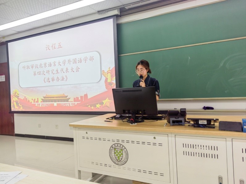 随后,外国语学部团学联组织部部长刘忠珊宣读了北京语言大学外国语学部第四次研究生代表大会《选举办法》,并详细讲解了本次大会的候选人差额和投票方式等。之后,大会审议并通过总监票人、监票人名单,宣读总计票人、计票人名单。