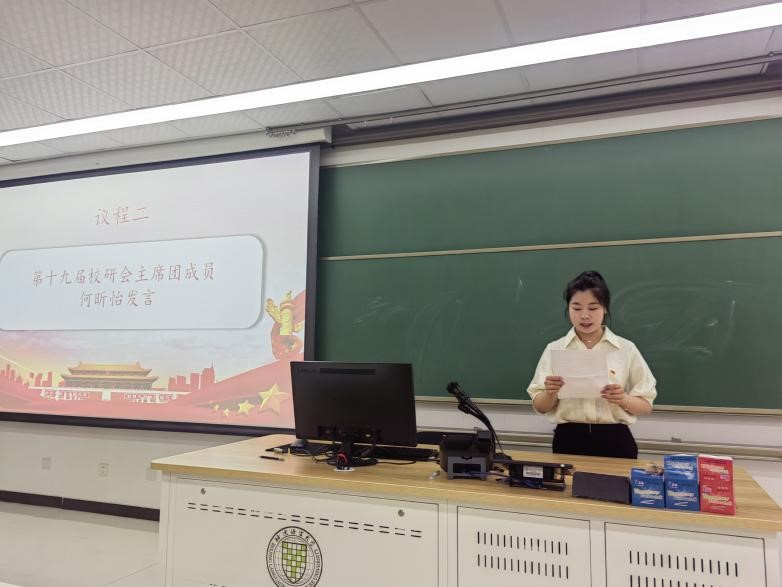 大会第二项议程,第十九届校研会主席团成员何昕怡进行发言。何昕怡表示十分荣幸参加此次研究生代表大会,希望候选人能够发扬奉献精神,服务精神,积极参与研究生代表事务;参会代表能够认真听取主席团候选人的汇报,审慎做出投票决定;监票人、计票人及工作人员能够严格遵守相关规定,秉持公正的态度,保障研究生代表大会各项议程有序进行。最后,何昕怡同学祝愿外国语学部研究生会越来越好。