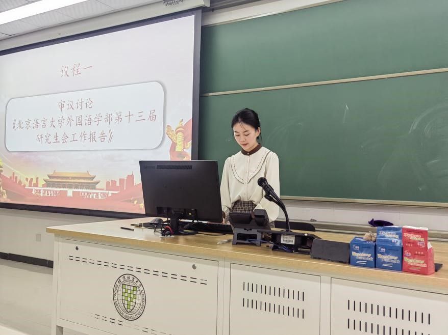 大会伊始,外国语学部团学联执行主席刘卓蕾宣读了《北京语言大学外国语学部第十三届研究生会工作报告》,对学部一年以来的研究生会工作进行了总结,参会研究生代表对此报告进行了审议与讨论。报告指出,第十三届研究生会在学部学生工作办公室曹鑫老师的指导下,坚持全心全意服务同学的根本宗旨,不断加强自身建设、增强服务能力,以创新的工作思路、踏实的工作态度、科学的工作方法,切实解决学部研究生在学习、生活、就业、交友等方方面面的问题。本学年,研会全体成员齐心协力,共开展了12场活动和4场交流会,包括“墨香引航”系列读书会、北语&北航“不期而语,天使然也”校际研究生交流活动、校园趣味寻宝越野赛、第四届研究生羽毛球大赛、与国际中文学院留学生赴四渡河社会主义新农村参观实践共建活动、“访故居、游京城”年终主题团建活动、“浪漫一夏”海淀公园团建活动、雅思&CATTI经验分享会、升学就业经验交流会等等,并完成相应的公众号推送和新闻发布,点击量累计五千余人。各项活动学生参与度高,活动效果好,研会干部也积累了很多经验,组织管理能力和专项技能得到进一步提升。