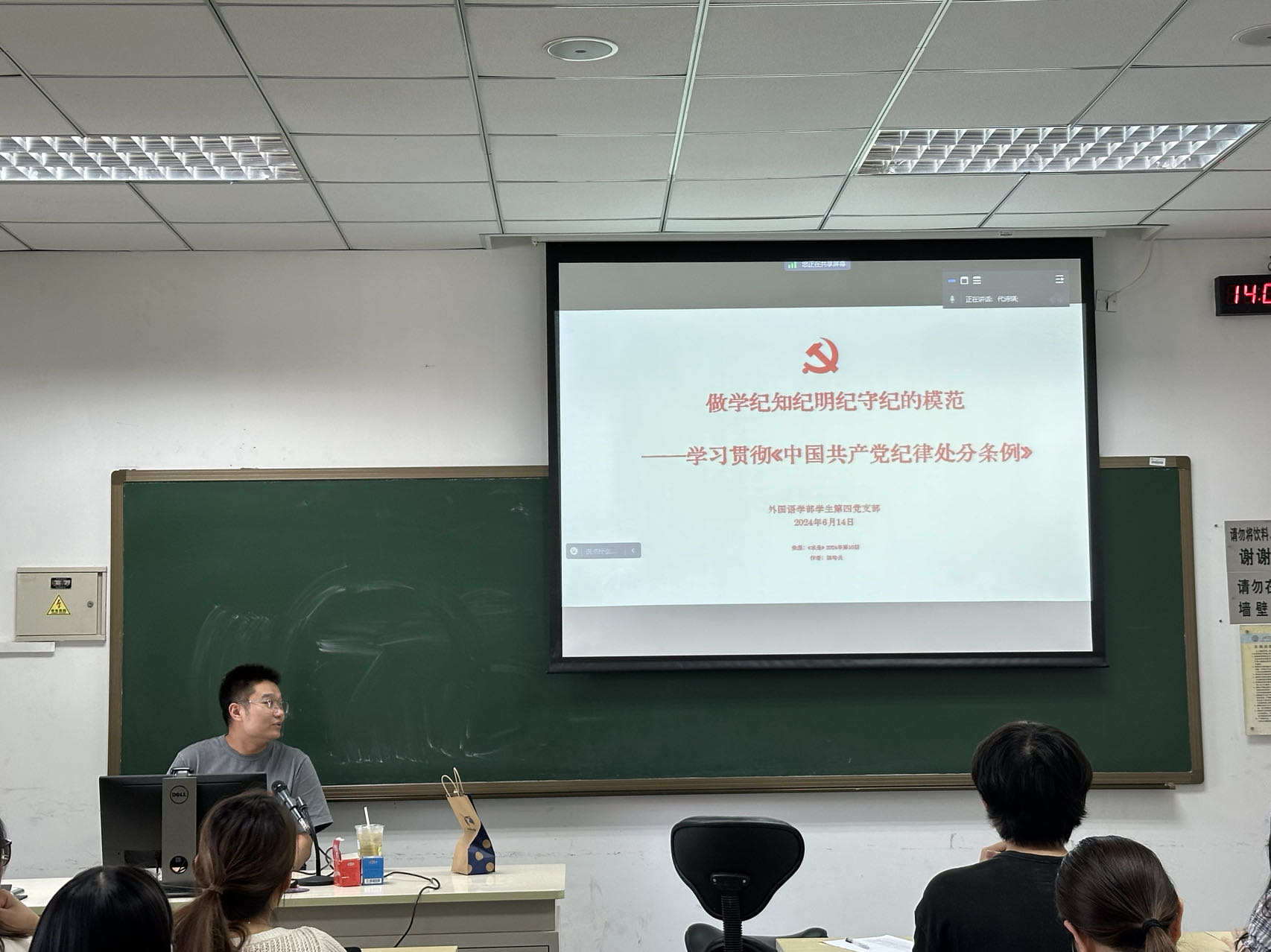 为进一步增强支部党员的纪律观念和规矩意识,深入学习贯彻《中国共产党纪律处分条例》,同时促进党员在校园内发挥模范带头作用,严格遵守校规校纪,外国语学部学生第四党支部于6月14日成功举办了一场以“做学纪知纪明纪守纪的模范”为主题的纪律党课。本次党课由党支部书记亲自授课,支部全体党员积极参与,共同上了一堂生动而深刻的纪律教育课。