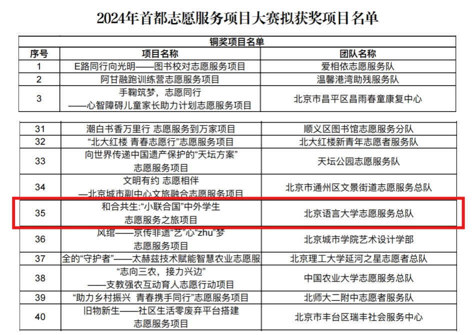 为传承新时代志愿服务精神,共绘中国梦蓝图,中共北京市委宣传部、中共北京市委社会工作部指导,共青团北京市委员会、北京市志愿服务联合会、北京市卫生健康委员会等部门共同主办2024年首都志愿服务项目大赛。北京语言大学“和合共生:‘小联合国’中外学生志愿服务之旅”项目通过资格审核、项目书评审、初赛、复赛等五层选拔,在1742个志愿服务项目中脱颖而出,进入首都志愿服务项目大赛决赛并荣获铜奖!