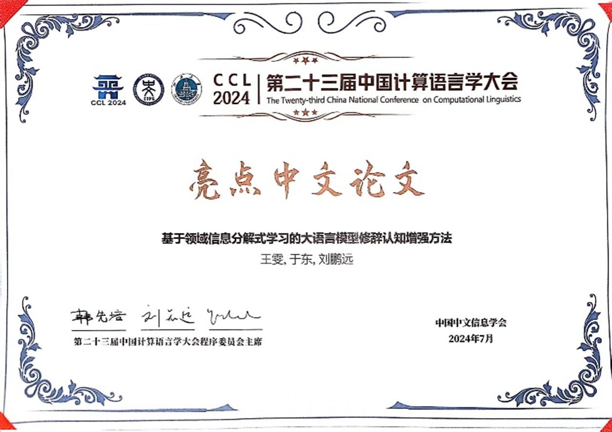 NLU&SoCo研究组硕士生王雯与于东教授、刘鹏远教授的论文《基于领域信息分解式学习的大语言模型修辞认知增强方法》被录用并入选大会口头报告,最终获得“亮点中文论文”奖项。这是继2014、2018、2019、2022、2023年之后,信息科学学院第六次获得该会议论文奖。