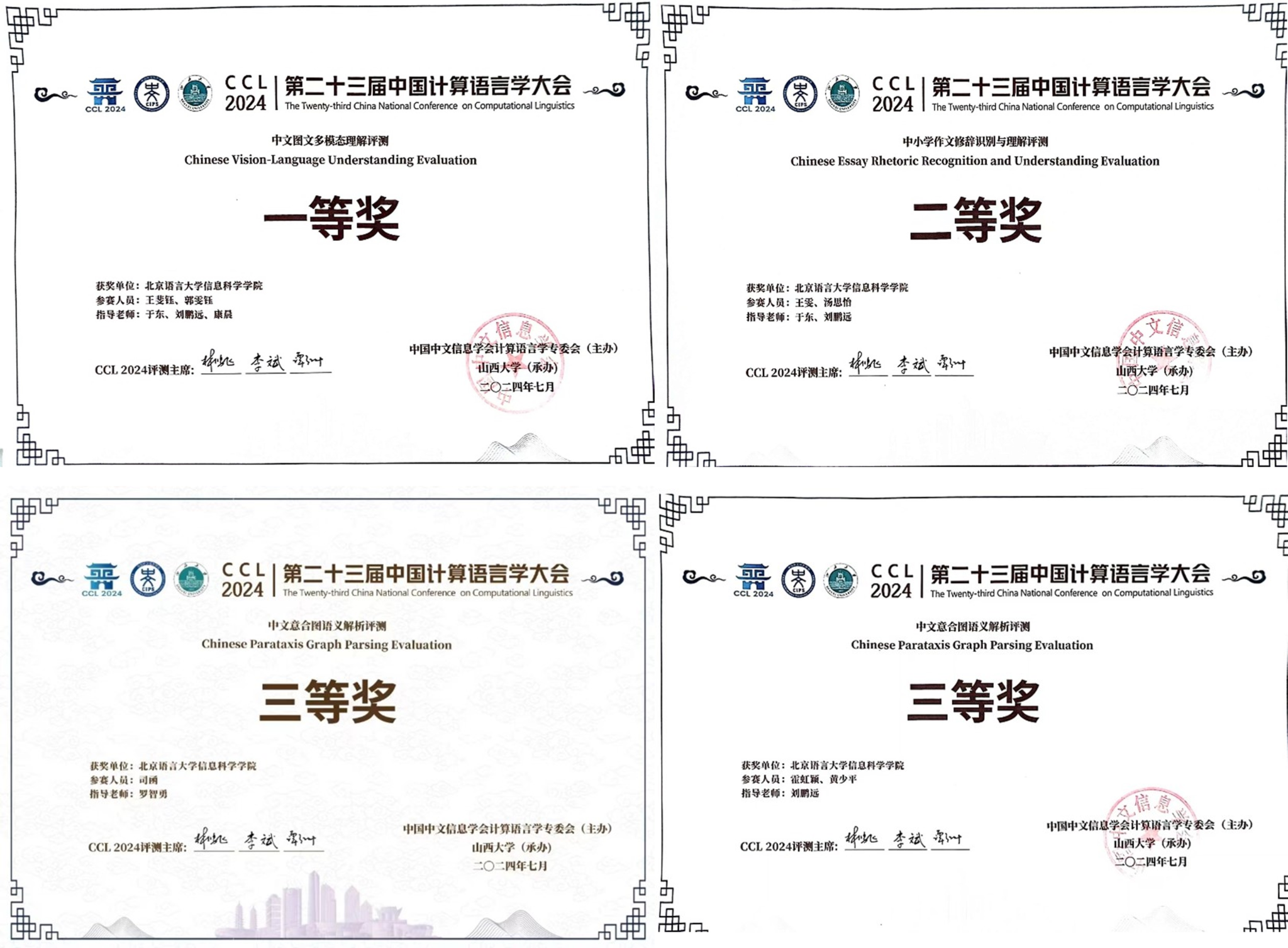 在评测环节,信息科学学院也派出多支本研究生团队参加大会评测。通过不懈努力,王斐钰同学团队获得中文图文多模态理解评测任务一等奖;王雯同学团队获得中小学作文修辞识别与理解评测任务二等奖;司函同学、霍虹颖同学团队(本科生)获得中文意合图语义解析评测任务三等奖。