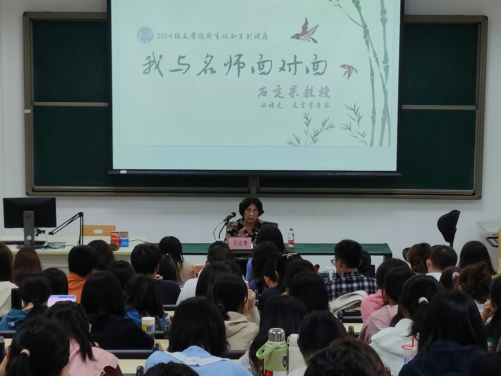 在讲座中,石定果教授结合自身大学求学经历,向同学们提出了四点如何更好地度过大学生活的具体建议。一是培养专业意识。她鼓励同学们从专业自在走向专业自觉,深入了解学科体系和专业培养方向,以“板凳要坐十年冷”的毅力构建集知识深度与广度为一体的知识结构,努力成为专业能力过硬、综合素质全面的“T”字型人才。她引用孔子“文献不足故也,足则吾能征之矣”对“文献”一词进行了详细解释,鼓励同学们要从对国家历史文化怀有温情和敬意的高度认识专业,以“赓续文脉”的责任感投入专业学习。二是培养共情能力。石教授通过“己所不欲,勿施于人”这句古语建议同学们珍视同窗情谊,鼓励同学们互敬互谅、互相友爱。她还生动讲解了良好的同学关系对专业学习的重要性,告诫同学们要避免因“独学而无友”造成“孤陋而寡闻”。三是培养进取精神。她勉励同学们“每一步都踏在地上”,并引用“天行健,君子以自强不息”和长江“百折必东”来激励同学们自立自强、努力奋斗。四是培养时间观念。石教授感概“少壮轻年月,迟暮惜光辉”,鼓励同学们要珍惜每分每秒的学习时间。她还引用古诗“莫见长安行乐处,空令岁月易蹉跎”,劝勉同学们牢记梦想,在面对诱惑时要保持自律。