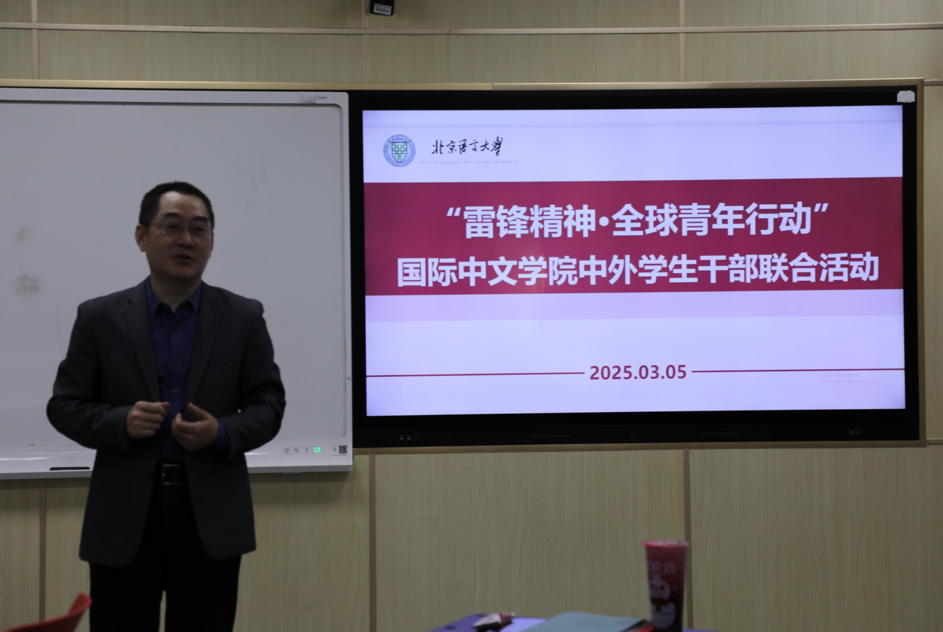 活动伊始,一段雷锋生平纪录片拉开活动序幕。影片展现了雷锋从贫寒少年成长为“人民勤务员”的历程,其“甘做螺丝钉”的赤子情怀令在场学子深受触动。随后,学院党委书记梁彦民老师就今天的活动主题发表致辞。他强调:“雷锋精神是跨越时空的文化符号,既需深入理解其内核,更需以行动传承其精髓。无论是郭明义式的当代楷模,还是海外中文教育志愿者的坚守,每个时代、每个国度都有属于自己的‘雷锋’——他们以微小善行凝聚大爱,以平凡坚守书写不凡。”