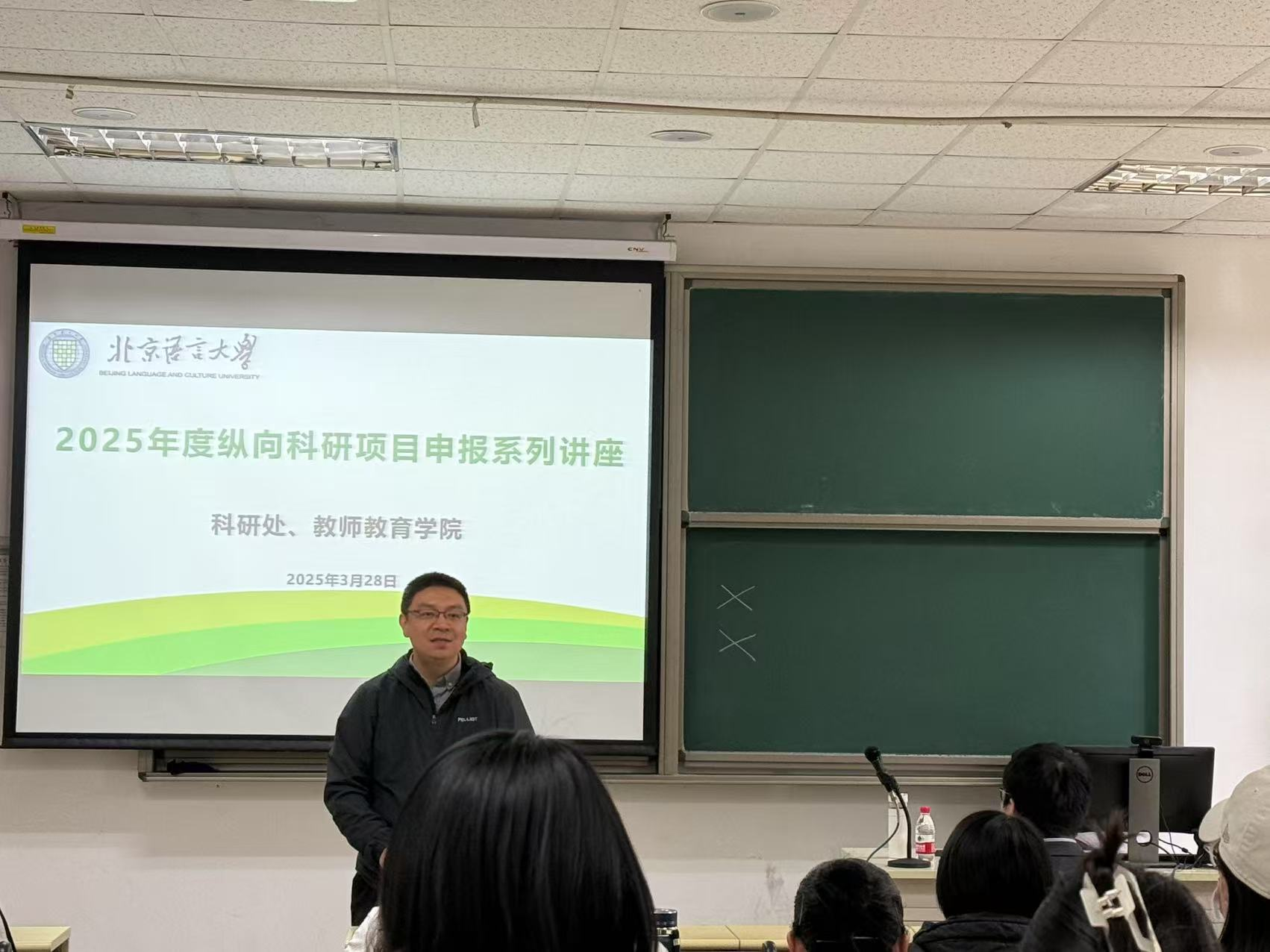 北语新闻网3月29日电(通讯员 郑家平 摄影 郑家平)为了进一步做好我校北京市教育科学规划课题申报工作,科研处联合教师教育学院于3月28日在教四楼103举办了“2025年度纵向科研项目申报系列讲座”之“北京市教育科学规划课题申报动员和经验交流会”。会议邀请了教师教育学院副研究员田一老师做经验交流。各单位教师代表和科研秘书约七十余人参加了交流会,会议由科研处处长黄伟主持。