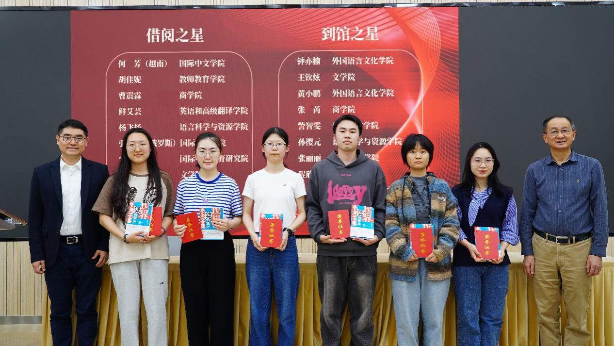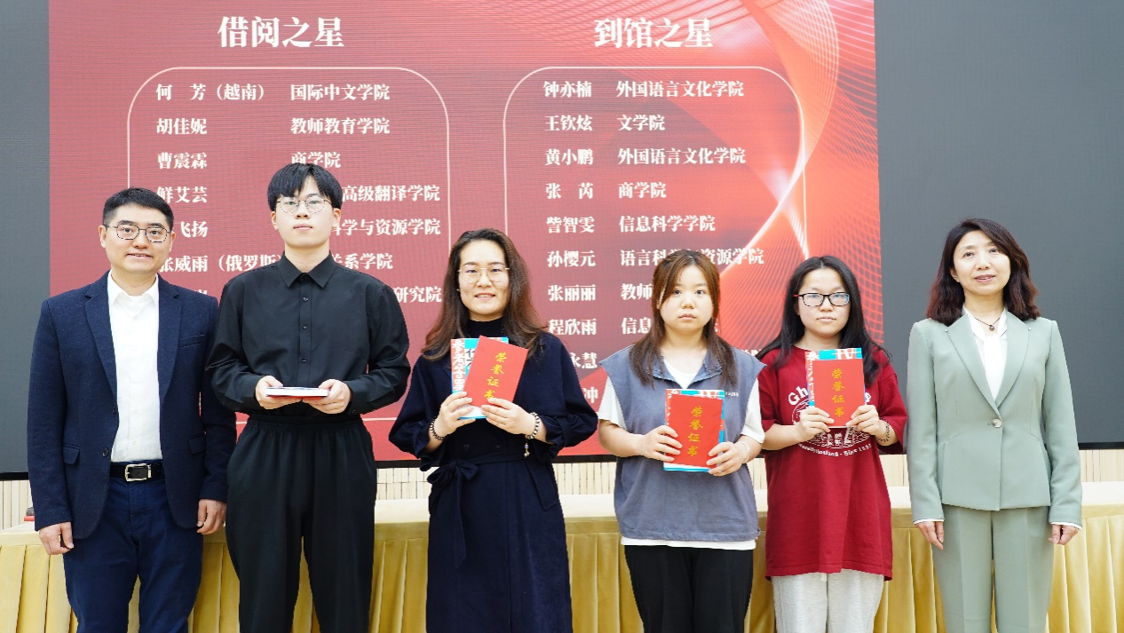 根据2024年全年的数据统计,本次语图阅读之星共评选出何芳等10名同学为“借阅之星”,钟亦楠等10名同学为“到馆之星”。魏晖副书记、张健部长和严飞老师分别为获奖同学颁发荣誉证书和奖品(严飞老师签名版赠书《世界作为参考答案》)。获奖代表在随后的发言中表达了对于图书馆丰富资源和优质环境的感谢,分享了阅读对个人成长的深远影响,并以不同角度阐释阅读的价值:既是知识的宝库,更是精神的栖息地。