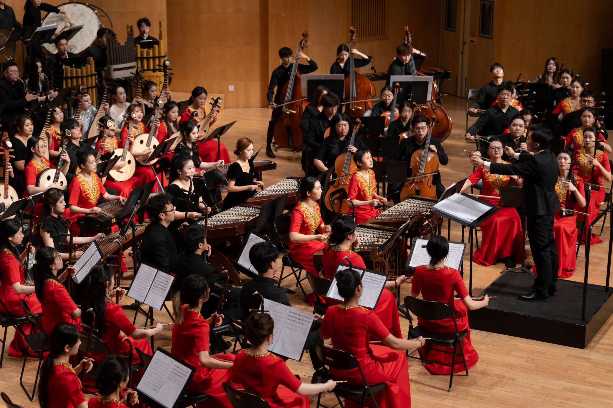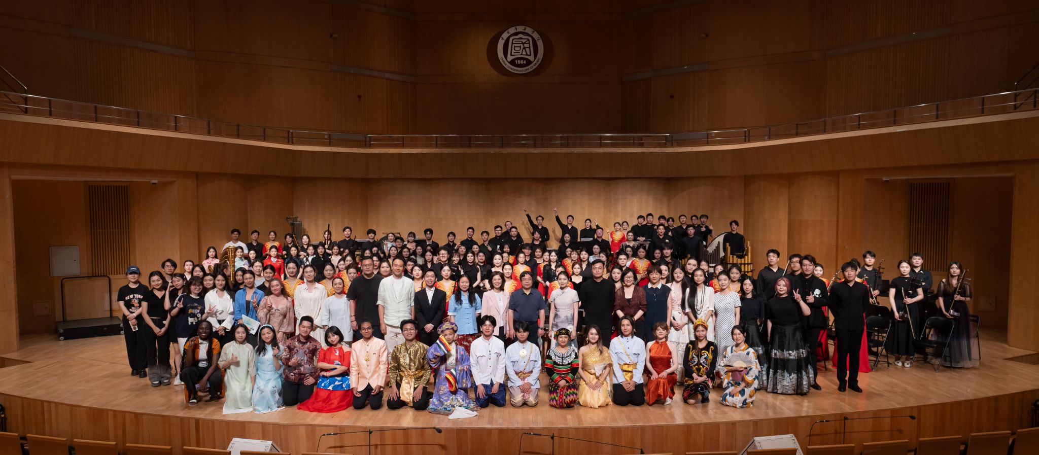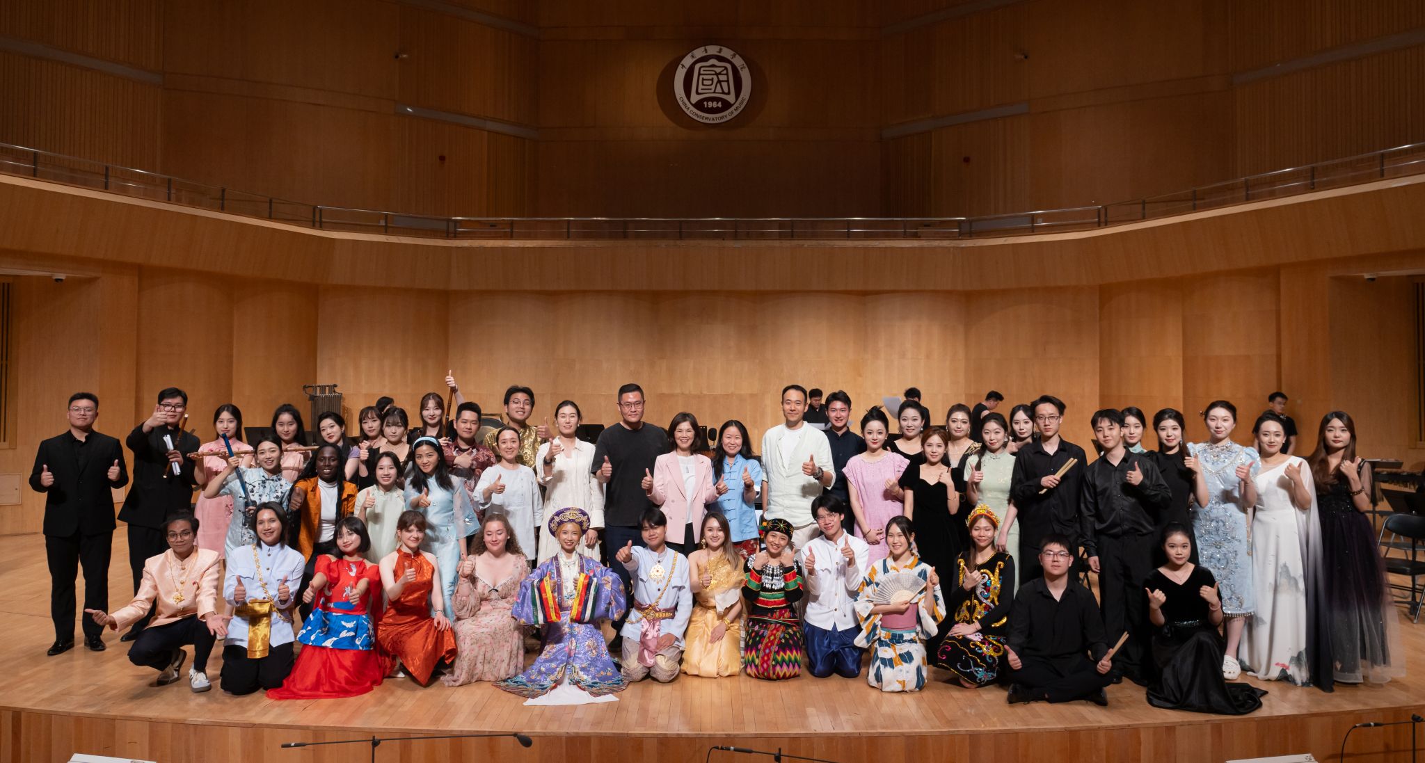 值得一提的是,在压轴大合奏《青青思念》与《北京喜讯到边寨》中,我校与中国音乐学院、澳门城市大学师生三方共同合作,携手呈现民族乐团融合演绎,形成百人同台、三地共奏的恢宏场面。我校的国际学生来自泰国、越南、缅甸、印度尼西亚、柬埔寨、日本、加纳、土耳其等多个国家,充分体现了“语言+艺术”的国际育人理念与北语多语多元的校园特色。