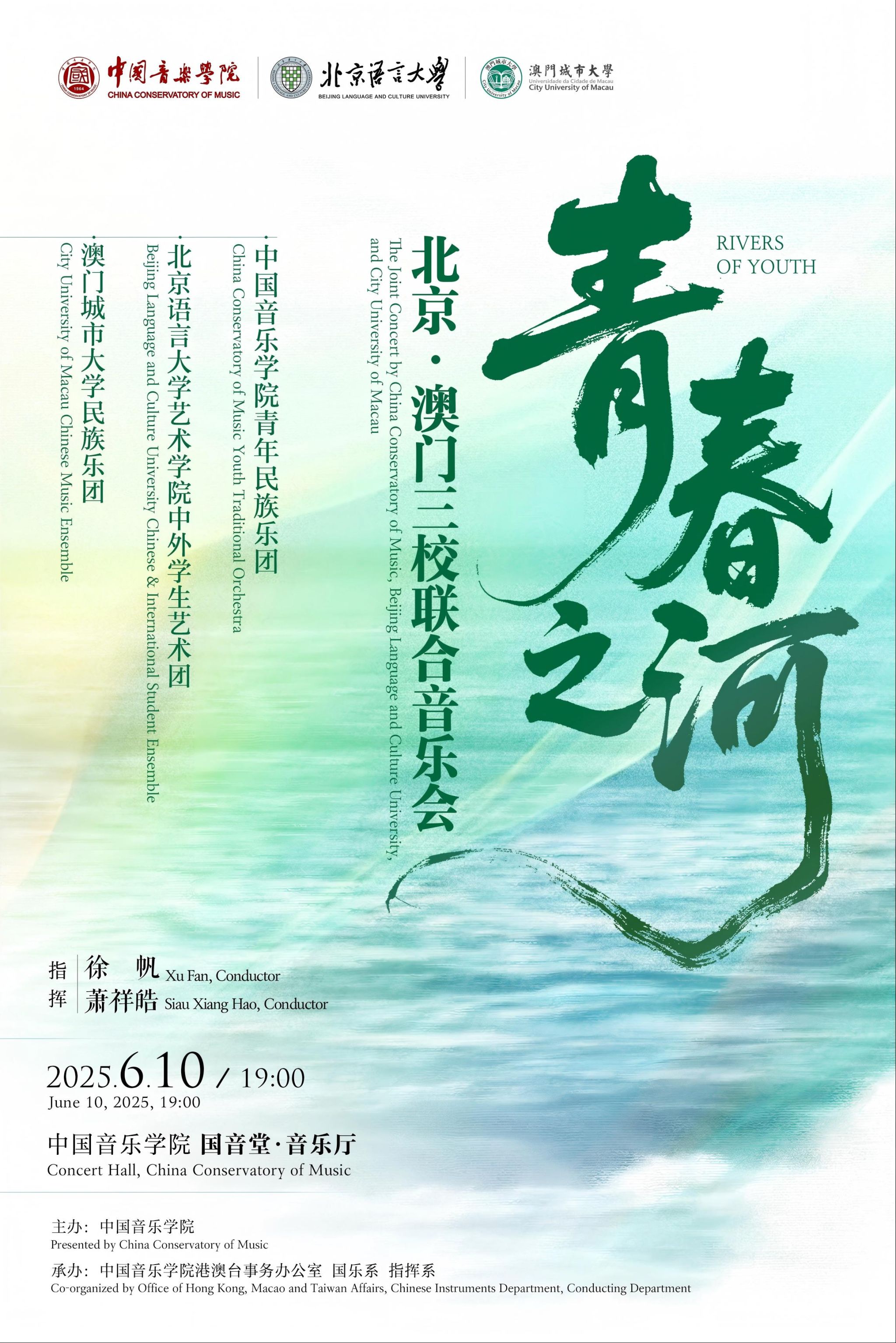 北语新闻网6月19日电(通讯员 凌博)6月10日晚,“青春之河——北京·澳门三校联合音乐会”在中国音乐学院国音堂音乐厅圆满举行。本次音乐会由中国音乐学院主办,中国音乐学院港澳台事务办公室、国乐系、指挥系承办,澳门城市大学协办。我校艺术学院中外学生艺术团携多项精彩节目参演,与来自中国音乐学院、澳门城市大学的青年学子共同奏响青春交响,谱写三地高校音乐交流新篇章。澳门城市大学教师徐帆、中国音乐学院指挥系2021级本科生萧祥皓执棒(按出场顺序)。中国音乐学院副院长吴志武、北京语言大学艺术学院院长陈霞、北京语言大学港澳台事务办公室副主任蔺颉、澳门城市大学学生事务处艺术分管主任兼艺术团行政总监高嘉琳出席本场音乐会。中国音乐学院国际交流合作处(港澳台事务办公室)张雅妹老师担任音乐会导聆。