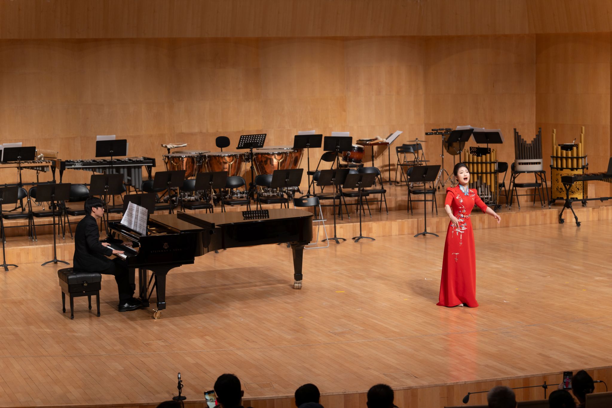 打击乐重奏《山响》率先登场,以澎湃鼓点展现山川之势,由艺术学院“寰语”打击乐团倾情演绎,既保留传统节奏魅力,又融入现代舞台表现张力,赢得现场热烈掌声。山东民歌改编歌曲《绣荷包的俏妹子》由郑雅慈演唱、冯睿智钢琴指导,展现了地方民间音乐的灵动与传情。国际学生艺术团则以《说唱中医药》《江畔独步寻花》两首风格迥异的歌曲联唱,传递中医文化精髓与古典诗词意境,呈现了中外融合的艺术创新。