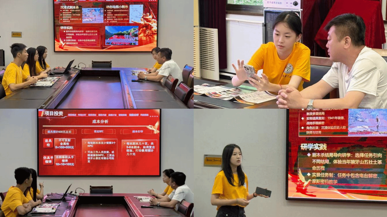 实践活动伊始,实践团队长李梓鸣向狼牙山景区武经理详细介绍了项目内容,重点阐述了“动态地图+剧本杀”微信小程序的设计理念与实施方案。边天怡同学对项目的营收方案和后期项目落地细节、景区人员安排做了详细规划介绍。狼牙山景区的武经理高度认可项目“寓教于乐”的创新模式,认为其轻量化运营优势能为红色文化传播注入新活力。双方就项目细节进行了深入交流,为后续合作奠定了坚实基础。