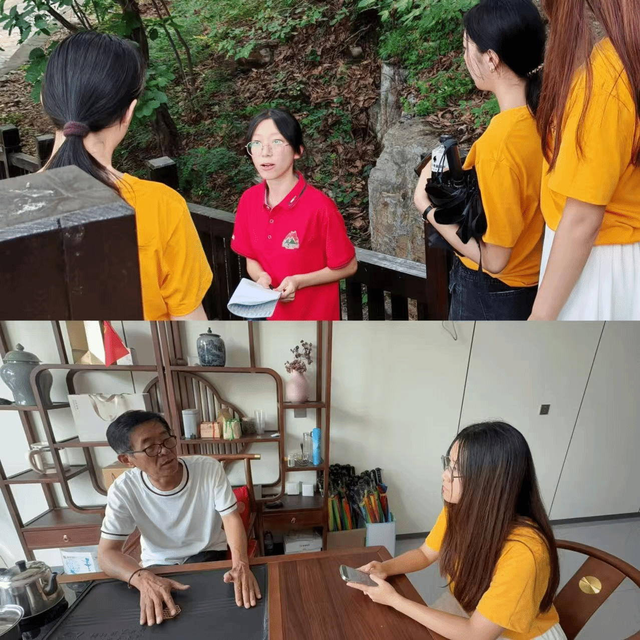随后,团队成员跟随当地向导,实地探访了五壮士跳崖处、棋盘陀等革命遗址。在海拔1100米的险峻山路上,同学们亲身体验了当年革命先烈战斗的艰辛。关紫茜同学感慨道:“站在英雄战斗过的地方,才能真正理解什么是‘宁死不屈’的革命气节。我们要用专业所长,让更多人感受到这种精神力量!”在狼牙山文旅研学培训中心,团队成员与老党员、研学中心张总经理深入交流。张总经理表示,用年轻人喜闻乐见的方式传承红色基因,既守住了历史的根,又开出了创新的花,对项目的教育意义和社会价值给予了充分肯定。团队还特别采访了多位游客,收集到关于小程序界面设计、剧情设置等宝贵建议,为产品优化提供了重要参考。