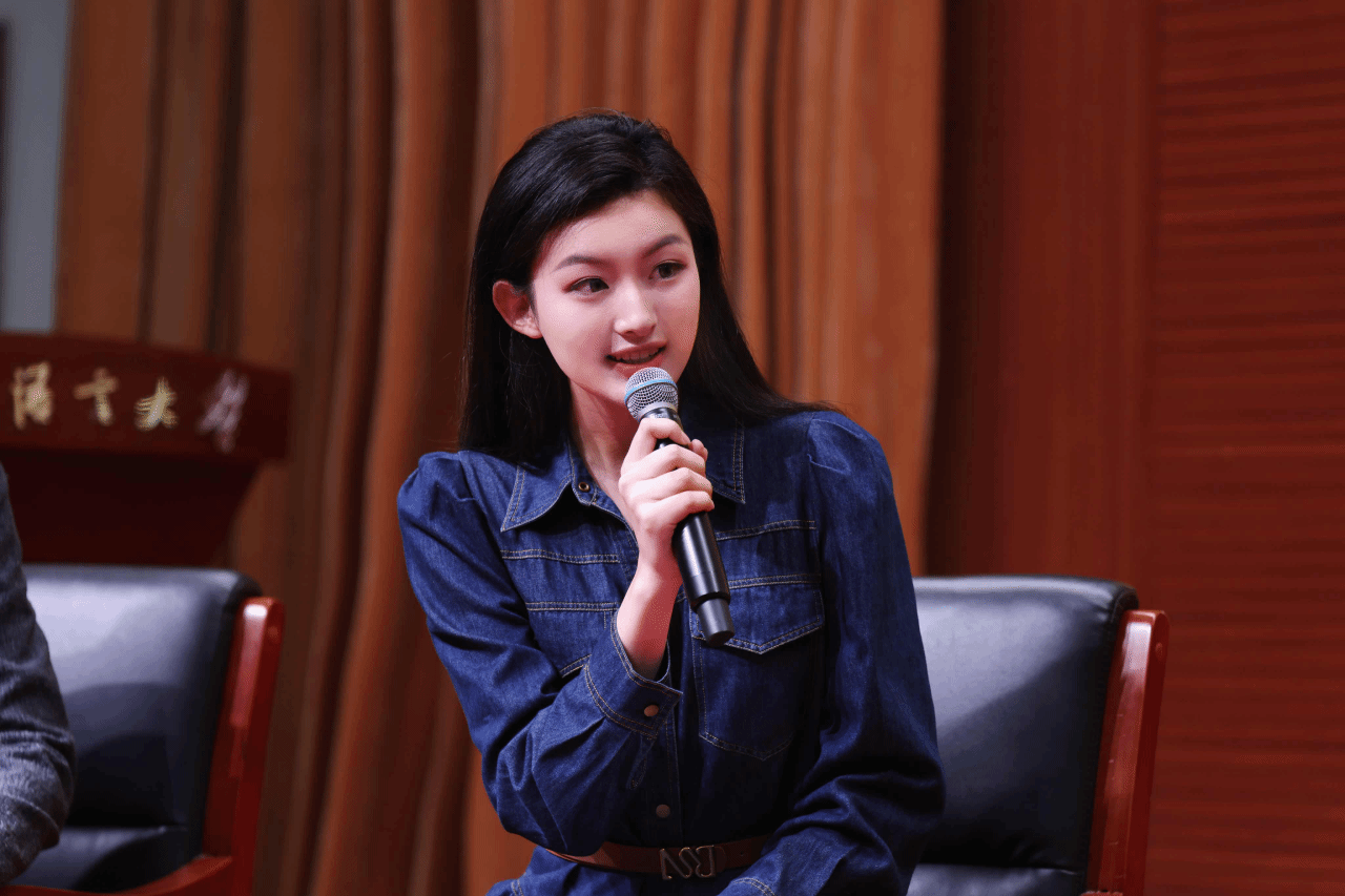 英高院24英播霍奕含担任本次活动主持助理,承担着衔接环节、沟通多方的重要角色。筹备阶段,她提前与搭档老师协调,协助团队梳理中英双语会谈提纲,从接到通知到正式活动,仅经历一次线下彩排与线上会议。谈及这次宝贵的主持体验,她说:“最开始接到任务时特别紧张,上场前还在后台反复背英文词。但很奇妙,候场时抬头恰巧看到他们一家迎面走来,因为我们都穿了牛仔面料的服饰,卡门·卓别林女士朝我轻轻一笑,那一刻所有忐忑都消失了,突然对这次对谈充满期待。特别感谢这次机会,让我安静看完一部卓别林纪录片,也敢在老师和观众随机提问时丢开手卡自由翻译,这段实践对我来说太珍贵难忘了。”