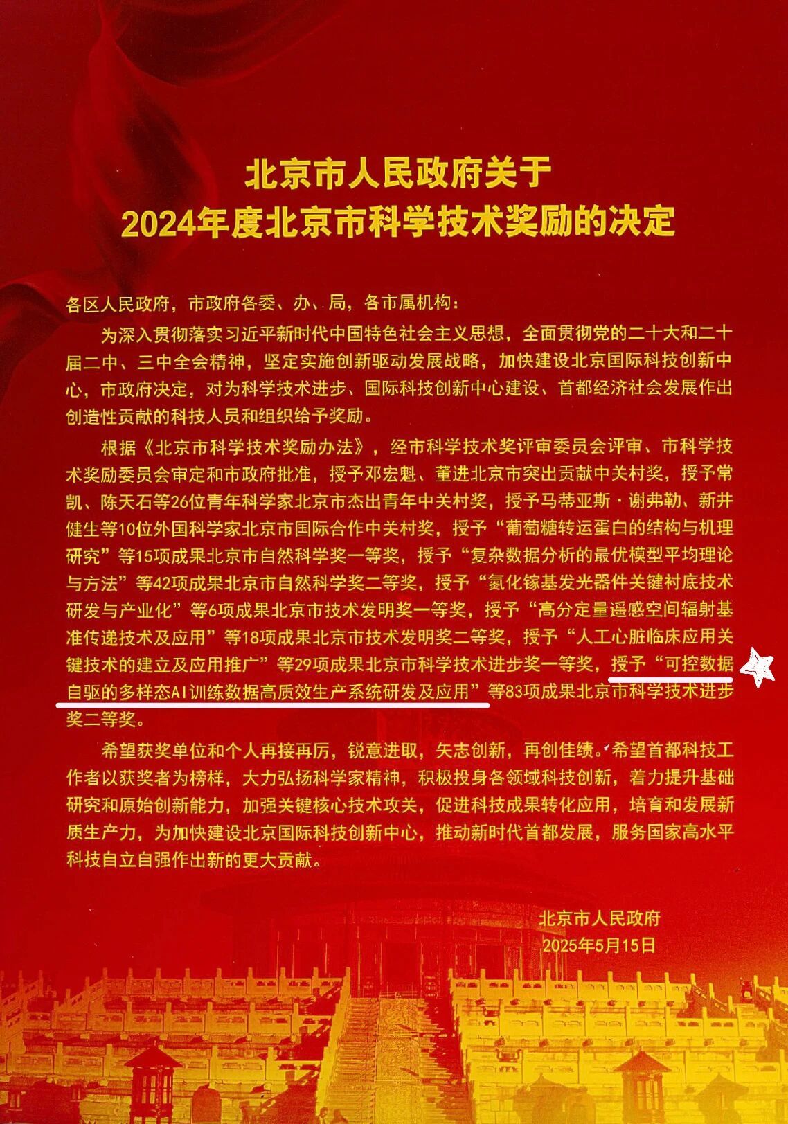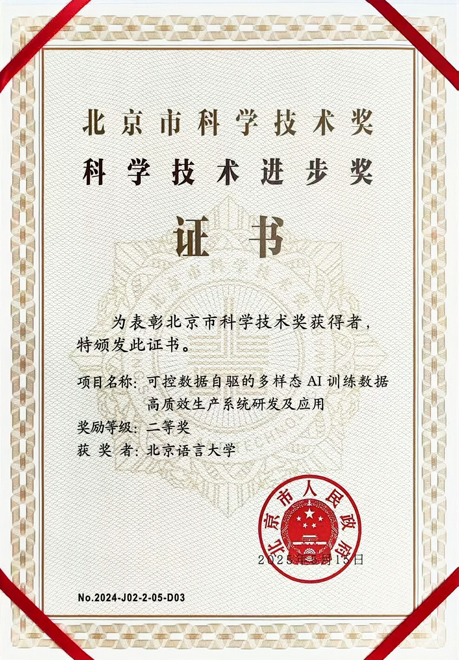 北语新闻网11月14日电(通讯员 陆瑶)11月7日,2024年度北京市科学技术奖励大会在北京隆重召开。北京市人民政府对一批在科技创新领域作出突出贡献的个人和项目进行表彰。北京语言大学信息科学学院联合海天瑞声、清华大学、中国信息通信研究院共同申报的“可控数据自驱的多样态AI训练数据高质效生产系统研发及应用”项目,荣获北京市科学技术进步奖二等奖。
