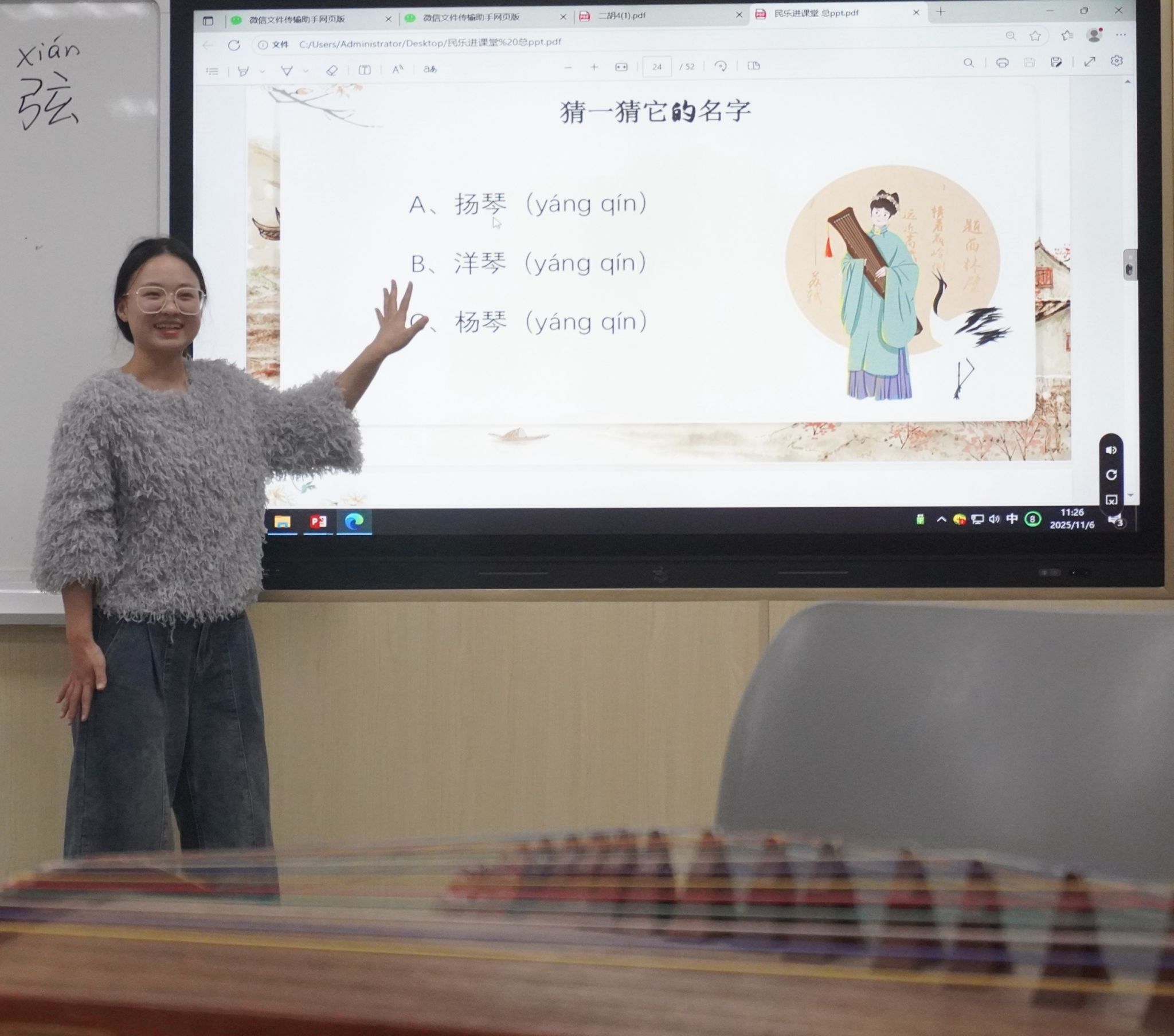 活动由艺术学院音乐国际教育专业的硕士研究生、音乐学(音乐国际教育与传播)器乐方向的本科生们联袂呈现。在活动中,同学们别出心裁地采用了“一讲一演,讲演结合”的独特形式。专硕同学们担当起文化使者的角色,他们运用精心准备的多媒体材料,以清晰易懂的语言,深入浅出地介绍了琵琶、二胡、古筝、笛子、扬琴等多种代表性民族乐器的历史与特色。为了让留学生们能迅速抓住每种乐器的精髓,每位讲解者都提炼出不超过三个关键词,如介绍古筝时聚焦于“形制、义甲、技法”,并在每个关键词后配合了示范演奏片段,这种化繁为简、生动形象的方式有效降低了理解门槛,赢得了留学生的广泛好评。教学环节中还增加了有趣的提问环节,例如乐器的制作材料以及乐曲的流派,留学生们纷纷积极抢答,并深刻学习记忆了与之对应“乐器”“画面”“鼓掌”等中文词汇。