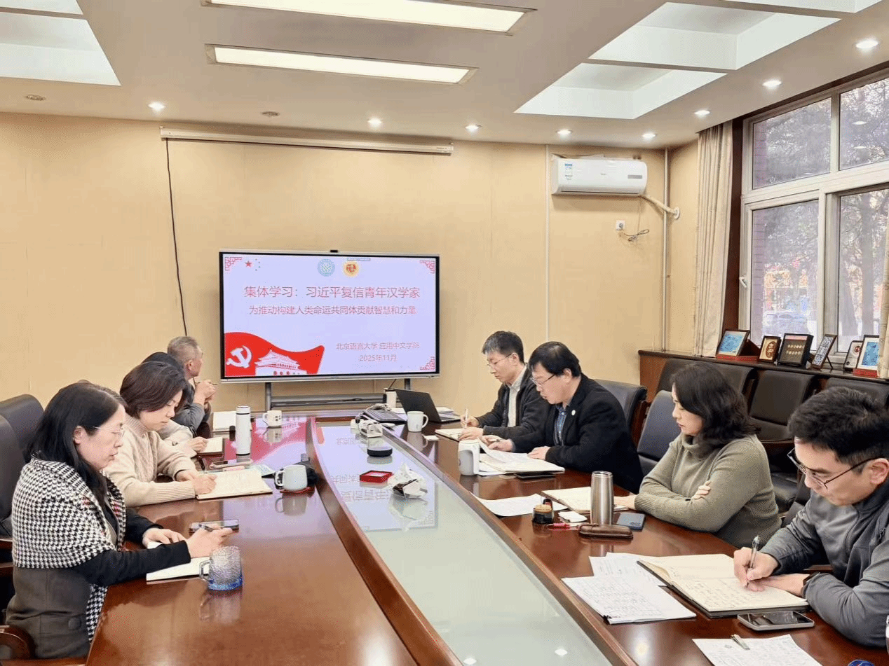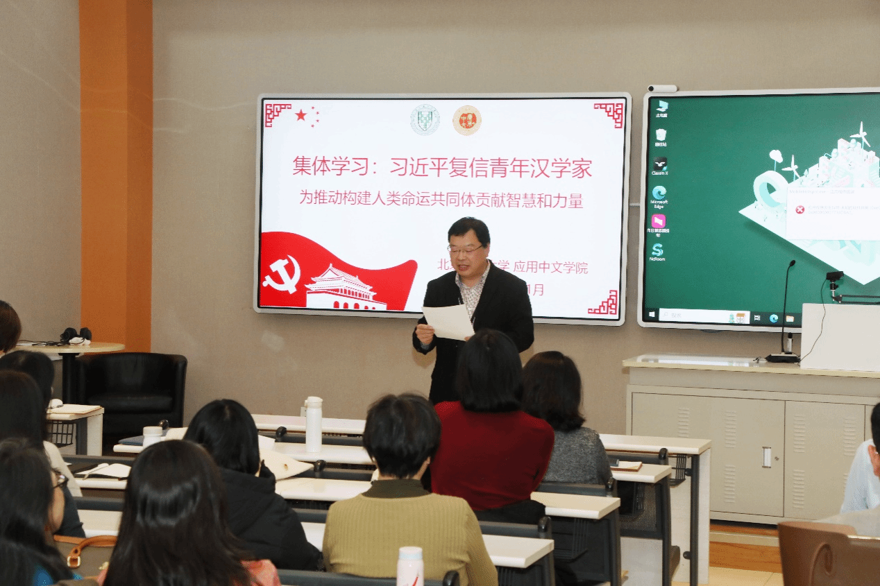 北语新闻网12月2日电(通讯员 白浩 摄影 闫思佳 李晨露)为深入学习贯彻习近平总书记重要复信精神,应用中文学院党委高度重视、迅速行动,分别于11月26日、12月1日两次专题组织学习活动。学院党委书记周鑫带领学院领导班子、全院教职工及中外学生代表,系统学习领会习近平主席给青年汉学家回信的核心要义与精神实质,号召广大师生将复信精神转化为实际行动,在汉语国际教育与跨文化交流中勇担使命,为推动构建人类命运共同体贡献智慧与力量。