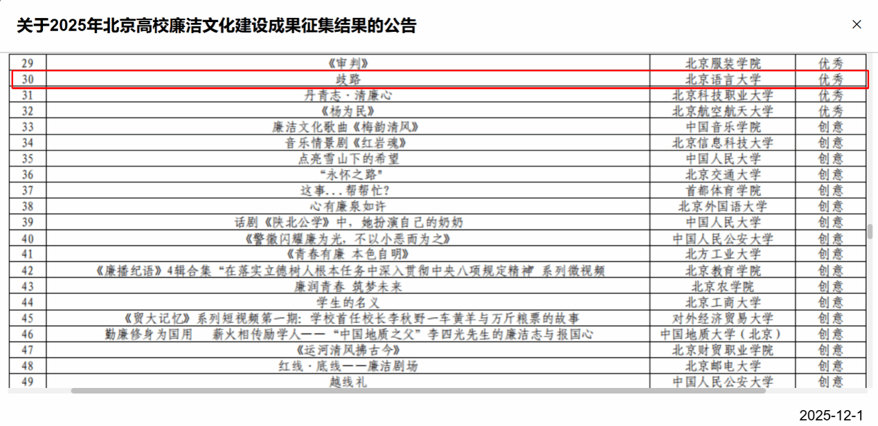 北语新闻网12月12日电(通讯员 吴柯 李倩)近日,2025年北京高校廉洁文化优秀作品评选结果正式公布。本次活动由北京市纪委监委、北京市委教育工委主办,以“廉润京华 清风育人”为主题,全市高校踊跃参与,共征集原创作品700余件,最终评选出精品成果76件、优秀成果70件、创意成果67件。我校曹刘淇同学团队创作的作品《歧路》脱颖而出,荣获优秀成果奖。