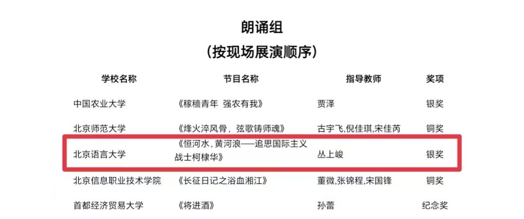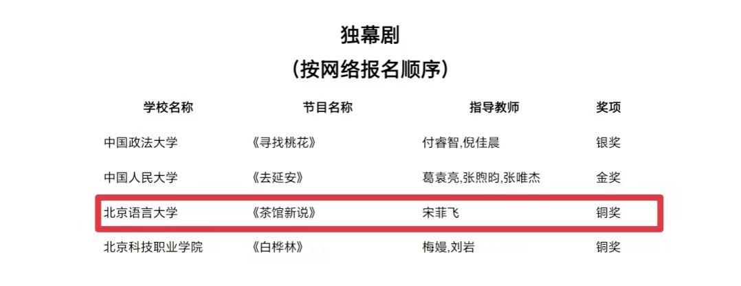 北语新闻网12月16日电(通讯员 段熠 李卓远)近日,在北京市教工委、北京市教委主办的以“艺启青春 逐梦京华”为主题的2025年北京大学生戏剧节展演活动中,我校中外学生艺术团的各支参赛队伍共取得了一金一银一铜的好成绩。