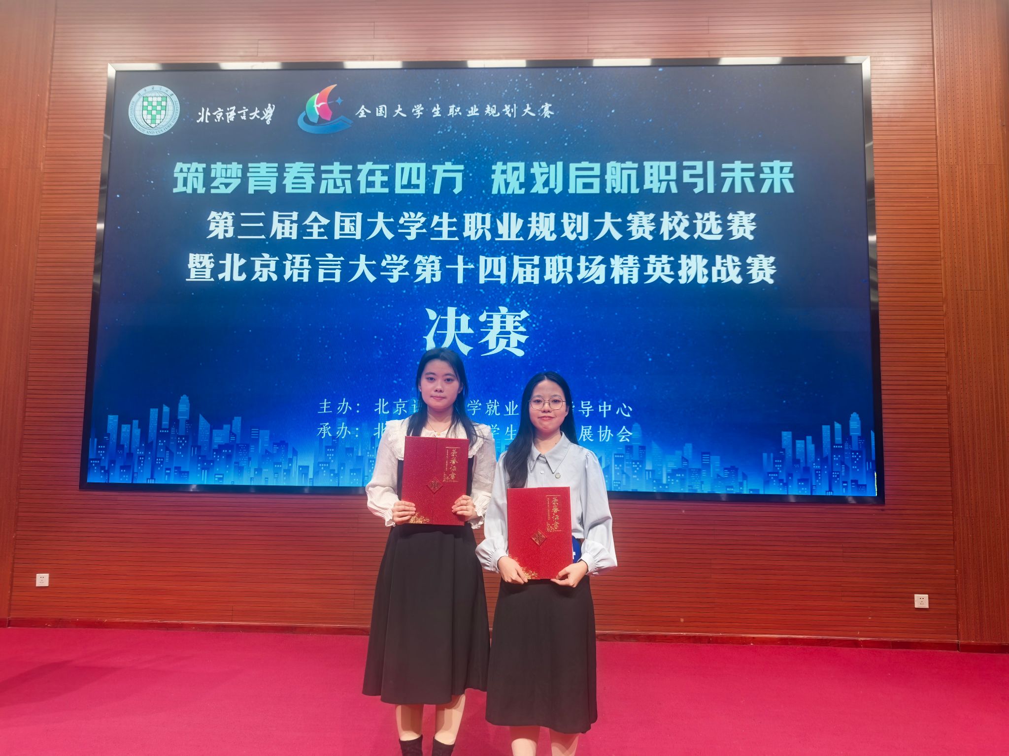 北语新闻网12月22日电(通讯员 黄梓芳 摄影 黄梓芳)12月18日,第三届全国大学生职业规划大赛校选赛暨北京语言大学第十四届职场精英挑战赛决赛在逸夫楼报告厅圆满落幕。大赛以“筑梦青春志在四方,规划启航职引未来”为主题,搭建了展示学子职业理想与专业素养的优质平台。国际中文学院2025级硕士研究生郑凯灵、魏艺珩代表学院参赛,凭借清晰的职业定位、扎实的专业积淀与精彩的现场表现脱颖而出,分别斩获一等奖与三等奖,为学院赢得荣誉。