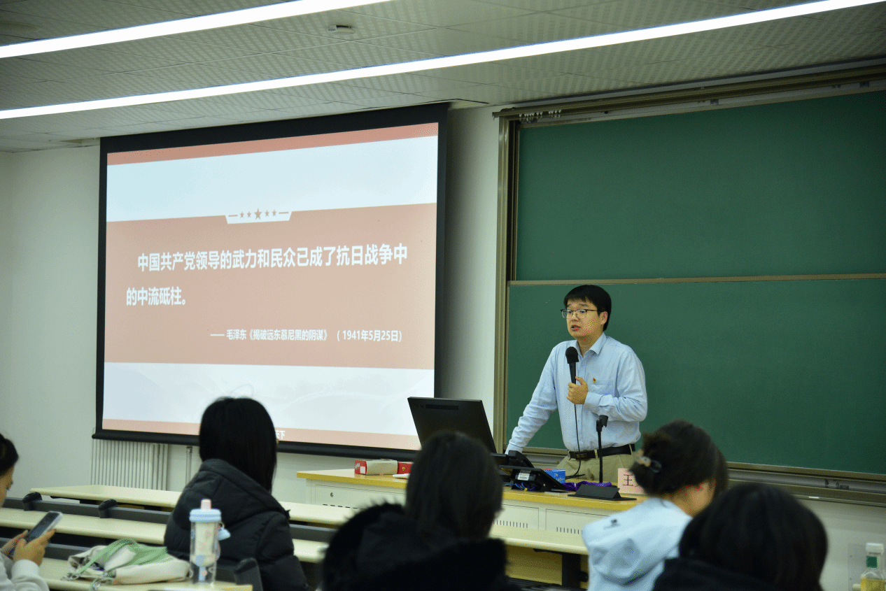 11月14日,马克思主义学院王义夫老师以“深刻认识中国共产党在全民族抗战中的中流砥柱作用”为题展开讲授。王老师从抗战时期的历史背景入手,围绕“一个半殖民地半封建的农业国如何战胜强大的帝国主义国家”这一命题,深入剖析了中国共产党在民族危亡关头所发挥的关键作用。他重点讲解了抗日民族统一战线的建立与发展、敌后战场的战略布局以及持久战理论的实践路径,生动描绘了中国共产党在抗战时期筑就血肉长城、绘就胜利蓝图、布下战略棋局、铸就团结基石、播撒民主星火的实践图景。王义夫老师表示,此次对抗战历史的回顾,既承载过去,也启迪未来,希望同学们能从中汲取信仰力量、学习奉献精神、坚定人民立场,为实现中华民族伟大复兴的中国梦贡献青春力量。