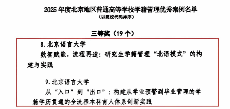 北语新闻网1月7日电(通讯员 闫丽霞)近日,2025年度北京地区普通高等学校学籍管理优秀案例遴选结果揭晓,我校报送的“数智赋能,流程再造:研究生学籍管理“北语模式”的构建与实践”、“从“入口”到“出口”:构建从学业预警到毕业管理的学籍学历贯通的全流程本科育人体系创新实践”两项案例成功入选并荣获三等奖!