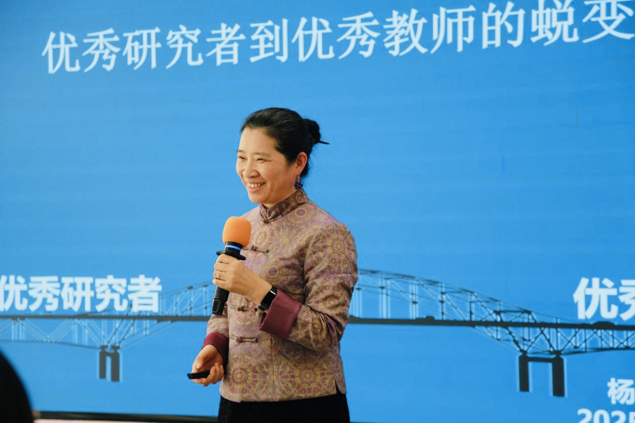国际中文学院杨玉玲教授以“优秀研究者到优秀教师的蜕变”为题,从“心中有爱、手中有法、眼中有光”三个方面分享了自己的体会,她提出教师要设计有价值的问题,引导学生主动思考,要做到深入浅出讲解,把科研和教学密切结合。