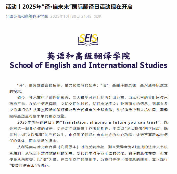 10月30日,“译・信未来”国际翻译日活动如期举行。学子们以笔为桥,在多语的世界里穿梭,用精准的译文传递文化的温度。